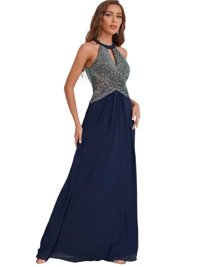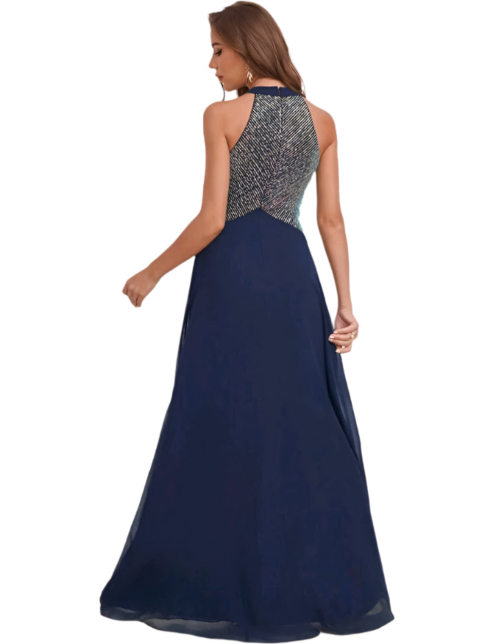 Címke nélküli, elegáns sötétkék maxiruha flitteres díszítésű felsőrésszel és lágy esésű sifon szoknyarésszel. Halter nyakú kialakítása modern és nőies megjelenést biztosít. Alkalmas esti eseményekre, bálokra és különleges alkalmakra.
