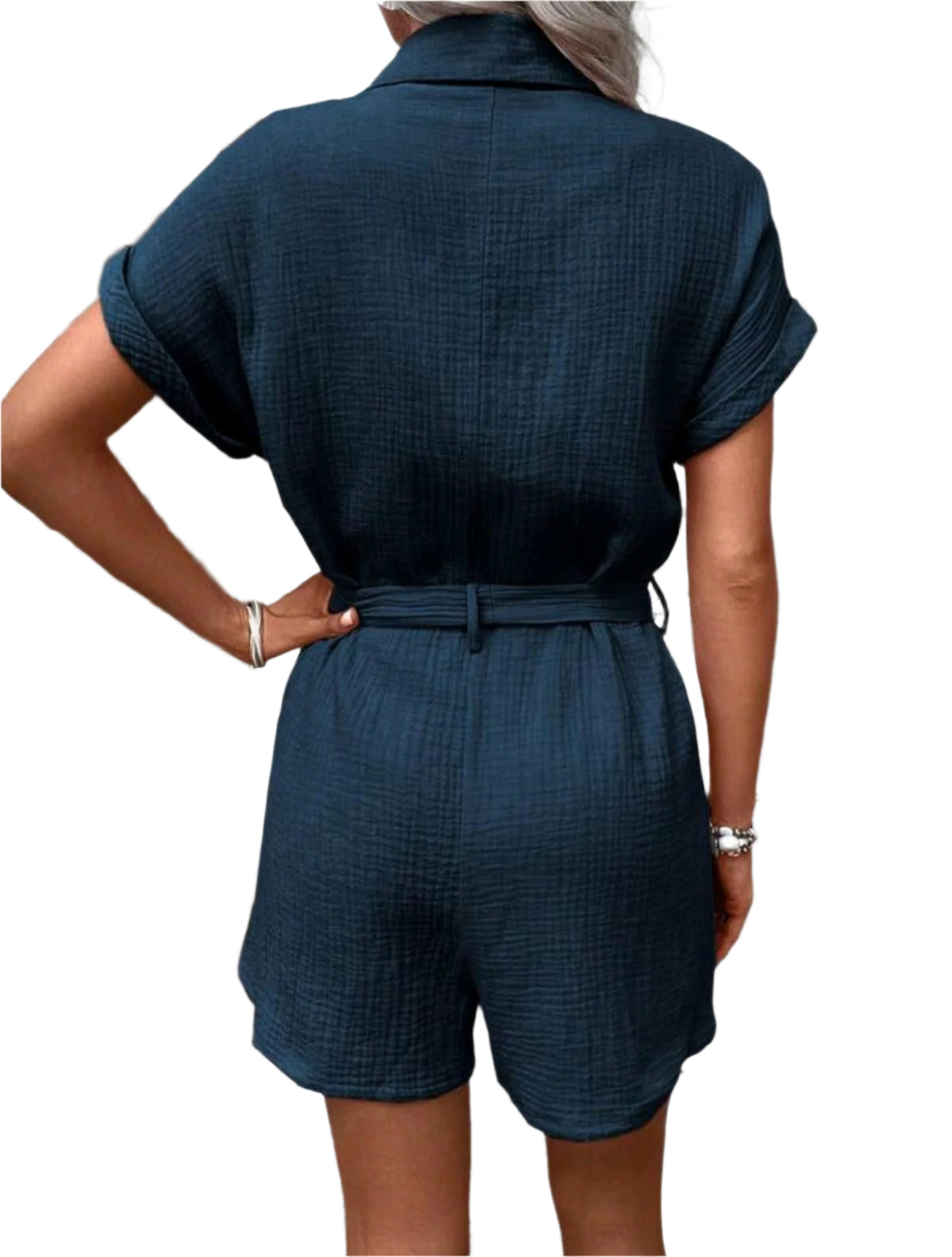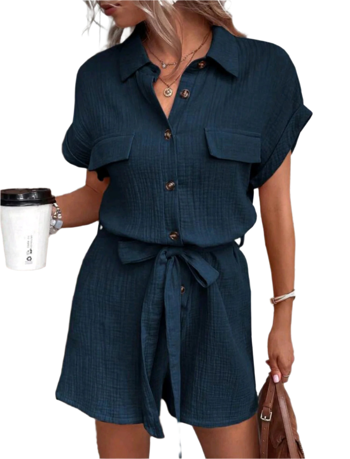 Címke nélküli, puha muszlin anyagból készült sötétkék overál, rövid ujjal, gombos előlappal és díszzsebekkel a mellrészen. A derékrészen megkötős kialakítás kiemeli a nőies sziluettet, miközben kényelmes viseletet biztosít. Tökéletes választás a nyári mindennapokra vagy hétvégi programokra.