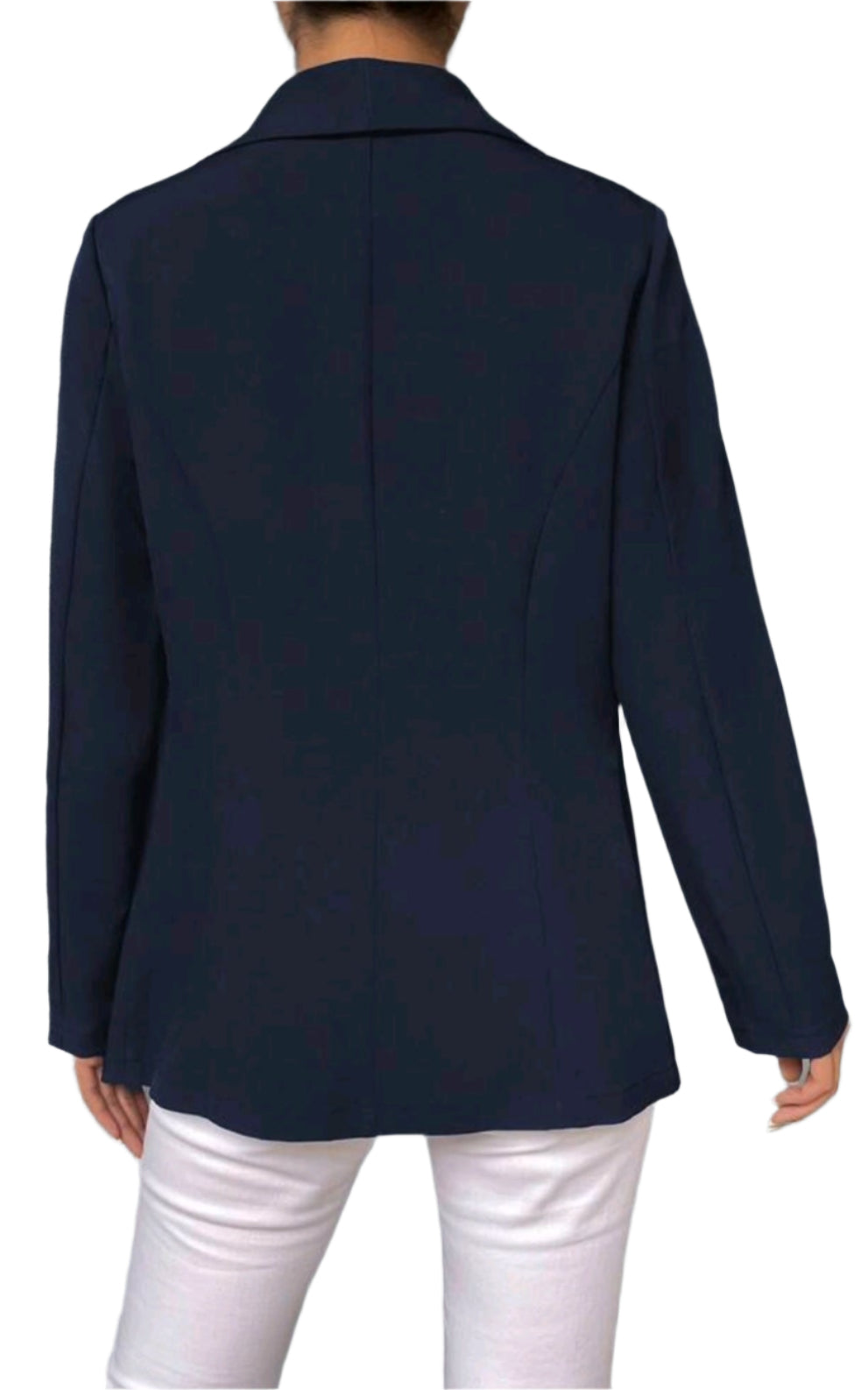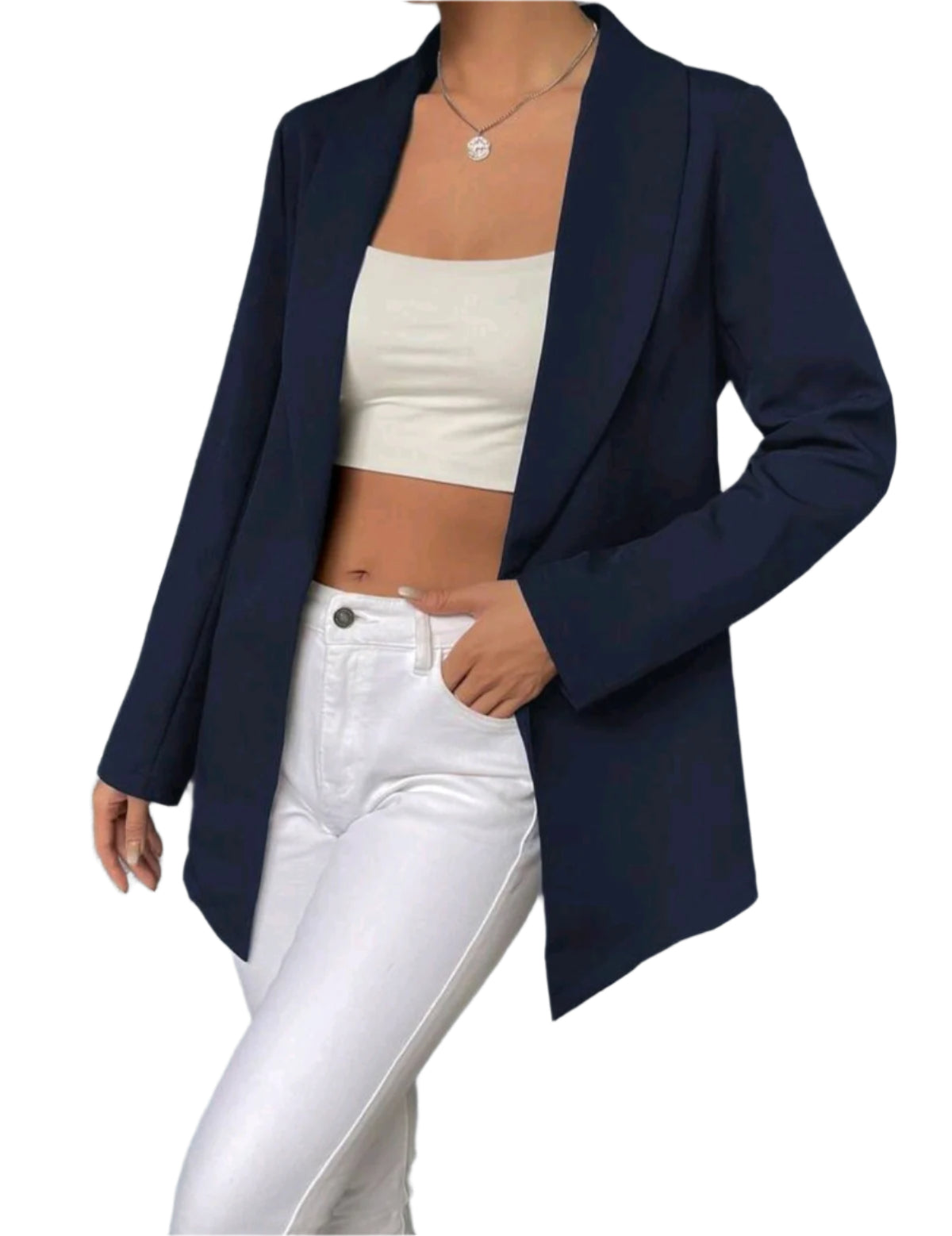 Címke nélküli, elegáns sötétkék blézer klasszikus, karcsúsított fazonnal. Galléros kivágása és hosszított szabása modern és kifinomult megjelenést biztosít. Könnyű, kényelmes anyagának köszönhetően ideális választás mind irodai viseletként, mind hétköznapi elegáns outfitekhez. Gomb nélküli, nyitott fazonja lehetővé teszi a laza, mégis rendezett stílus kialakítását.