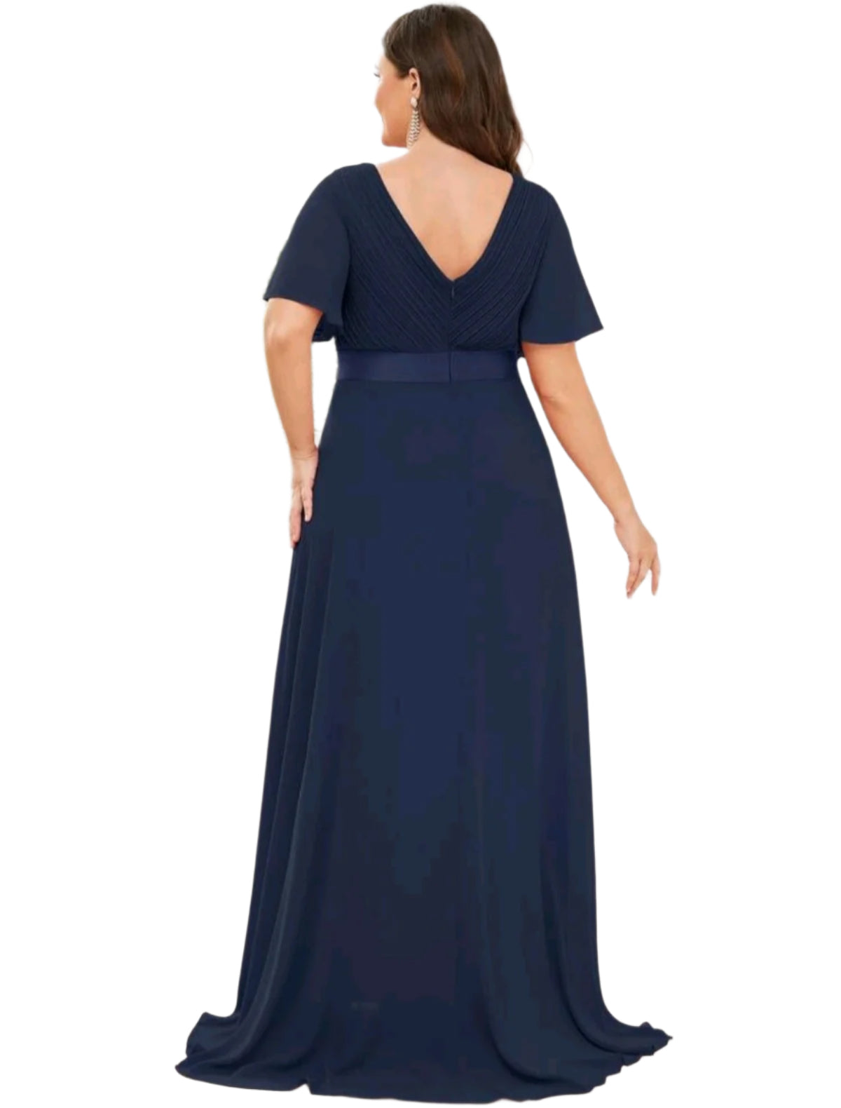 Címke nélküli, elegáns, V-nyakkivágású, sötétkék alkalmi ruha pliszírozott mellrésszel és lágy esésű, rövid pillangóujjakkal. Emelt derékrésze hangsúlyozza az alakot, míg az A-vonalú, hosszú szabás nőies megjelenést kölcsönöz. Ideális választás esküvőre, bálra, ünnepi alkalmakra vagy estélyi eseményekre.