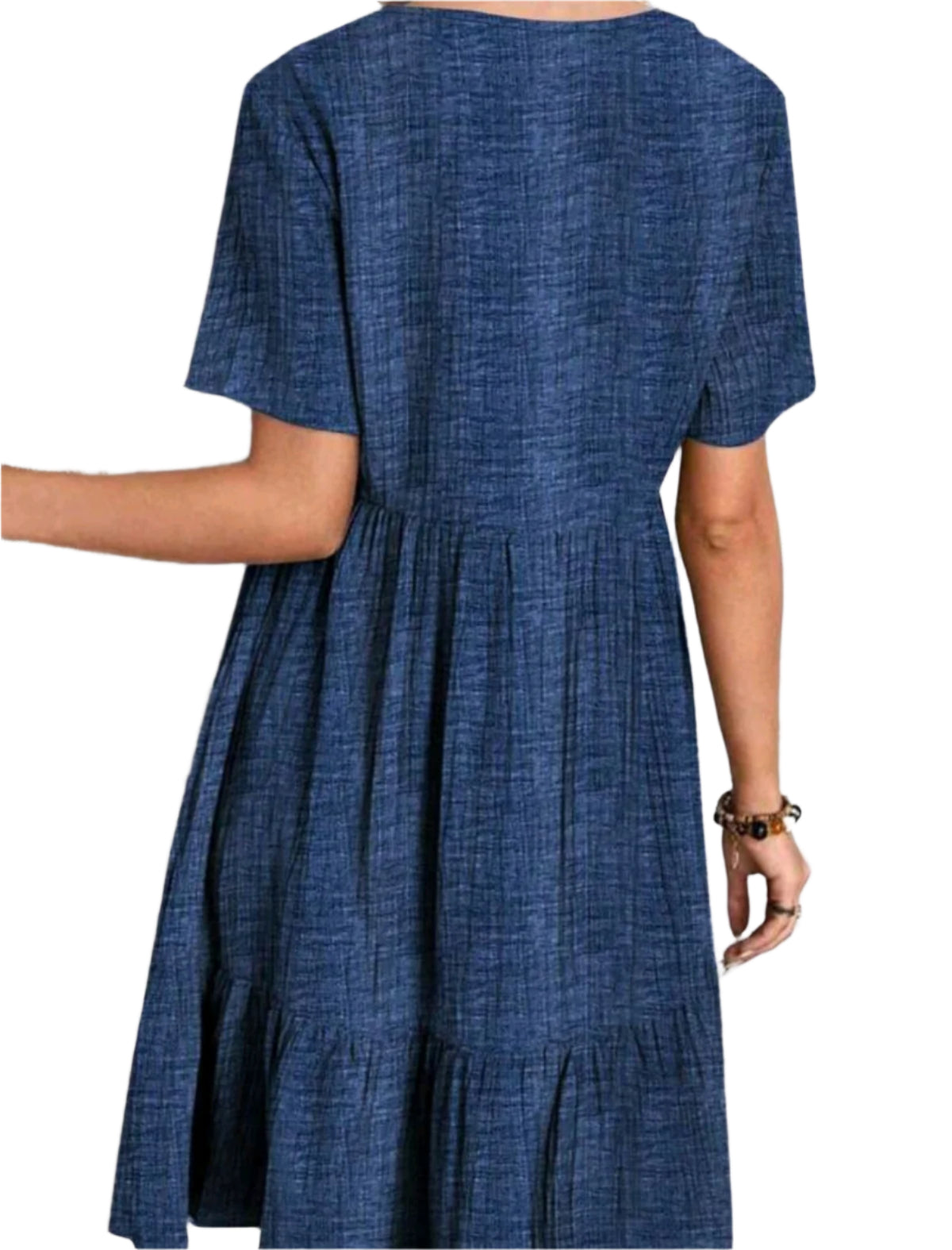 Címke nélküli, könnyed esésű, sötétkék rövid ujjú ruha V-kivágással. Laza, bő szabása és fodros alsó része kényelmes viseletet biztosít. Tökéletes hétköznapi outfitekhez vagy nyári kirándulásokhoz.