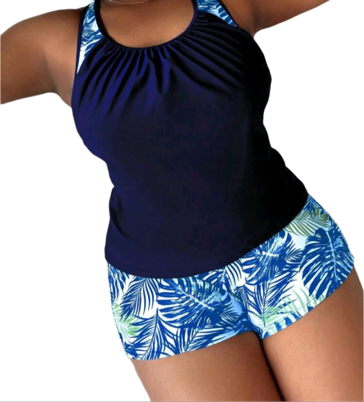 Címke nélküli, kényelmes és sportos stílusú tankini szett. A felsőrész sötétkék színű, trópusi mintás vállpántokkal és enyhén ráncolt mellrésznél, amely kiemeli a dekoltázst. A rövidnadrág fazonú alsó kék-fehér-zöld pálmaleveles mintával készült, amely vidám, nyárias megjelenést biztosít. Kiváló választás strandoláshoz, úszáshoz vagy aktív pihenéshez.