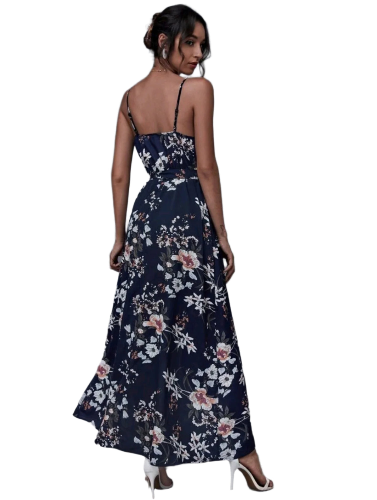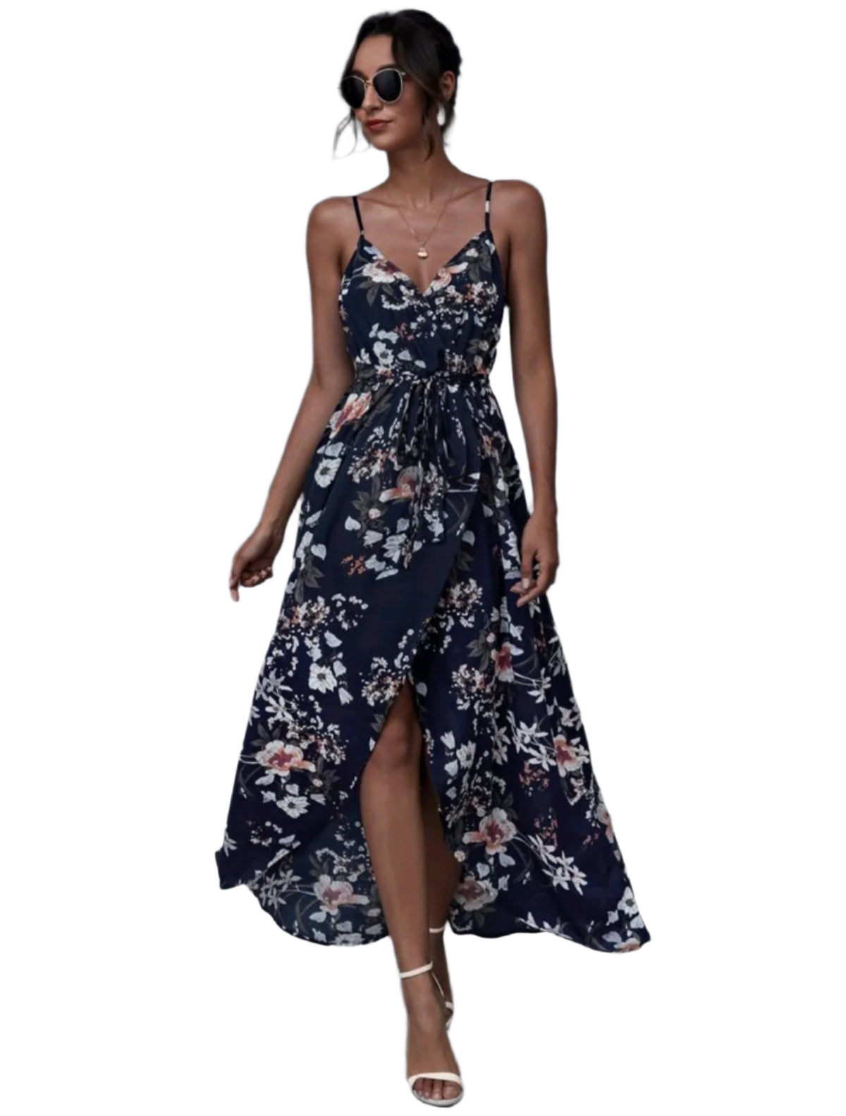 Címke nélküli, sötétkék maxi ruha romantikus virágmintával. Vékony pántjai és V-kivágása nőies megjelenést biztosít, míg a derékrészen megkötős szabás kiemeli az alakot. Az aszimmetrikus szegély és az elöl sliccelt kialakítás elegáns és könnyed viseletet garantál. Tökéletes választás nyári estékhez vagy alkalmi eseményekhez.