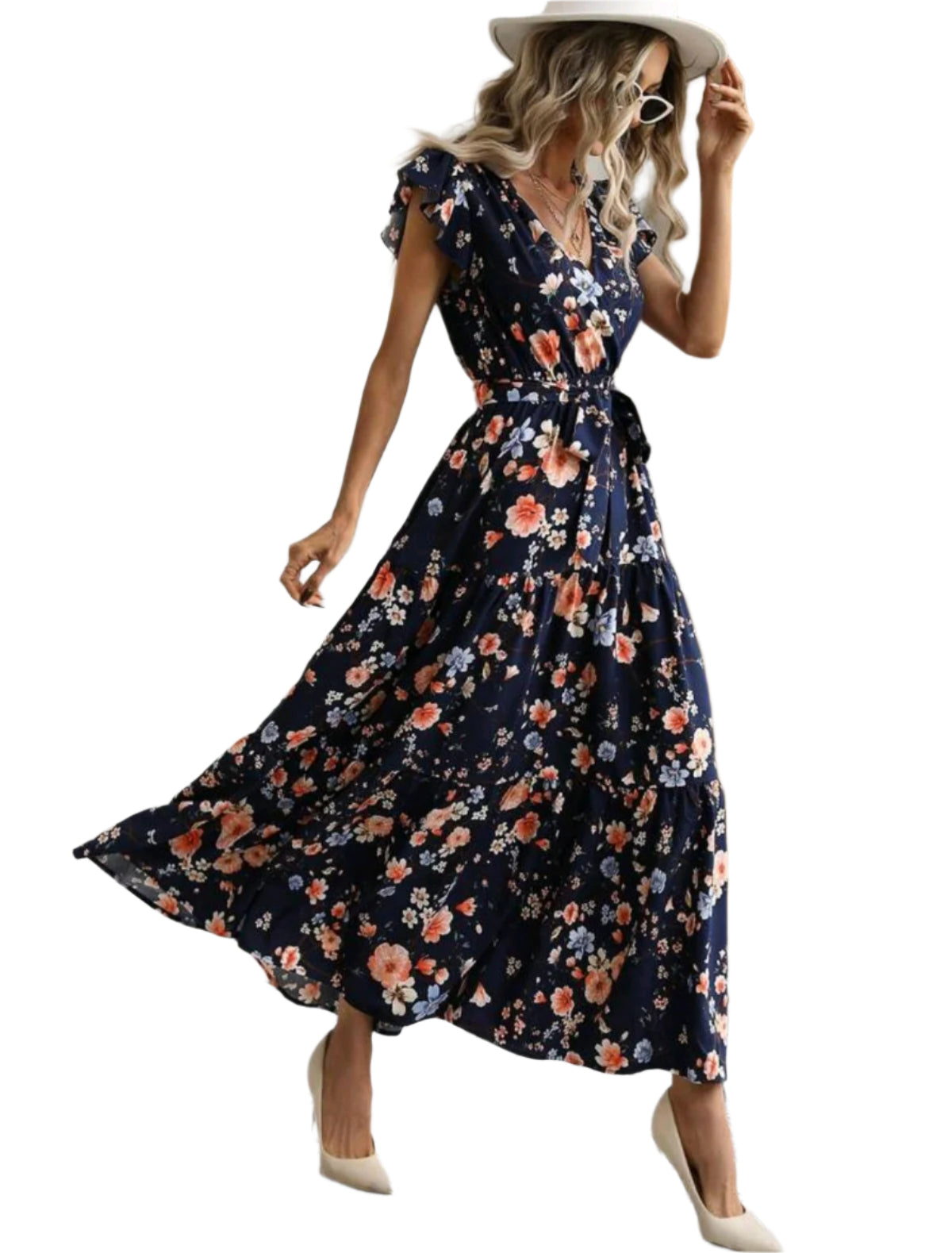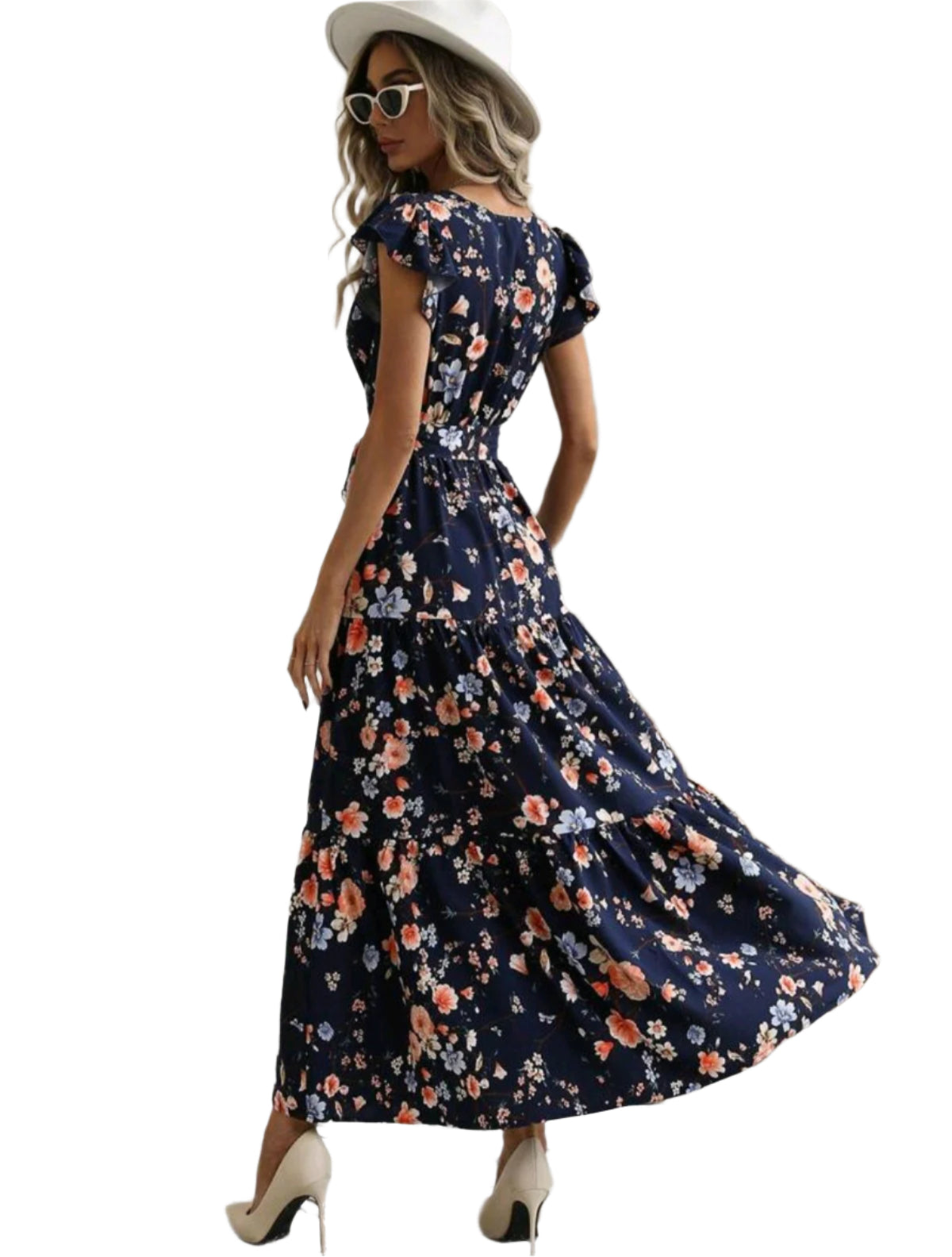 Címke nélküli, sötétkék alapon élénk virágmintás maxi ruha, V-kivágással és rövid fodros ujjakkal. Deréknál megkötős szabásvonal hangsúlyozza az alakot, míg a könnyed, rétegezett szoknyarész nőies és légies megjelenést kölcsönöz. Ideális tavaszi és nyári alkalmakra, például piknikekre vagy nyaralásra.
