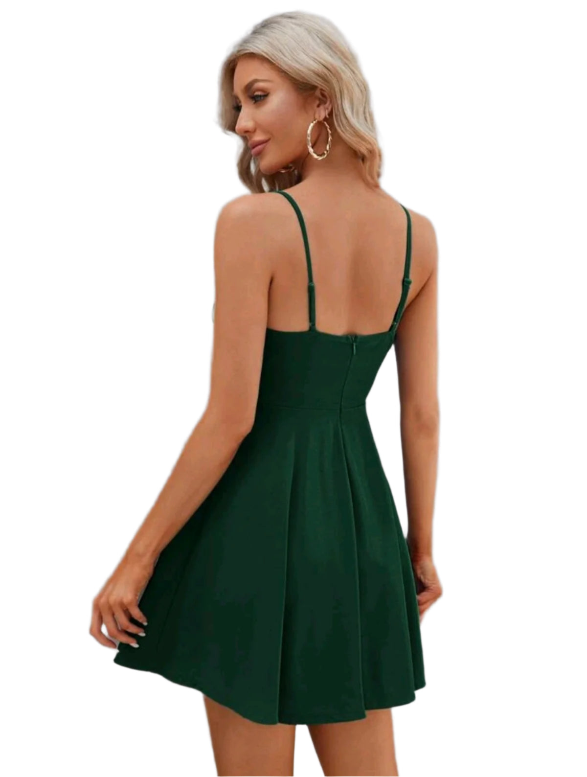 Címke nélküli, elegáns sötétzöld mini ruha puha, könnyed esésű anyagból. Keresztezett V-kivágású felsőrésze és vékony spagettipántjai nőies és kifinomult megjelenést biztosítanak. Derékban karcsúsított szabása és az A-vonalú szoknyarész kényelmes viseletet nyújt, ideális nyári napokra, alkalmakra vagy romantikus estékhez.
