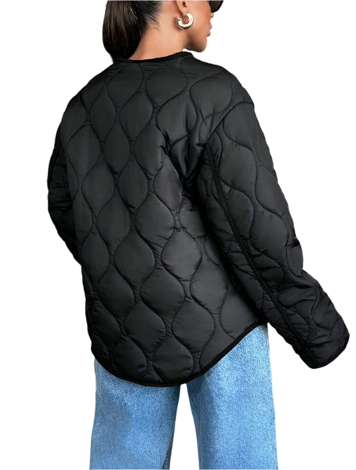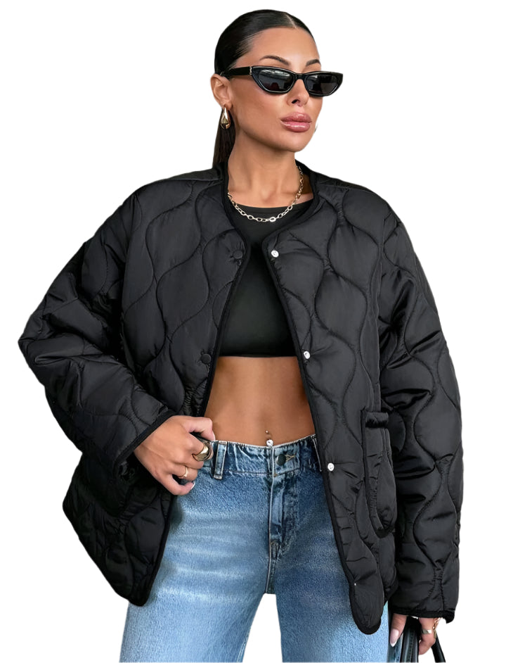 Címke nélküli, divatos steppelt kabát modern, laza szabással. Vékony, de meleg béléssel rendelkezik, így tökéletes választás az őszi és tavaszi időszakra. Gombos záródás és praktikus oldalzsebek teszik kényelmessé és stílusossá. Sportos és casual szettekhez is könnyedén kombinálható.