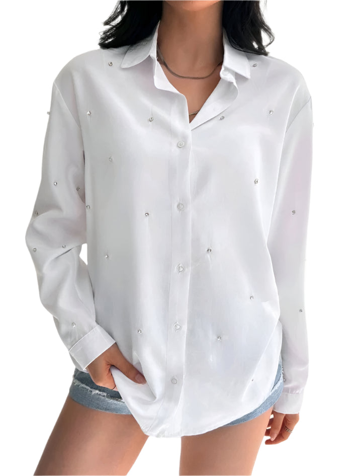 Címke nélküli, hosszú ujjú, laza fazon, klasszikus gallérral és gombos záródással. Letisztult fehér alap, apró strasszköves díszítéssel, amely elegáns és kifinomult hatást kölcsönöz. Könnyed, légies anyag, amely kényelmes viseletet biztosít. Tökéletes választás hétköznapi és alkalmi összeállításokhoz egyaránt.