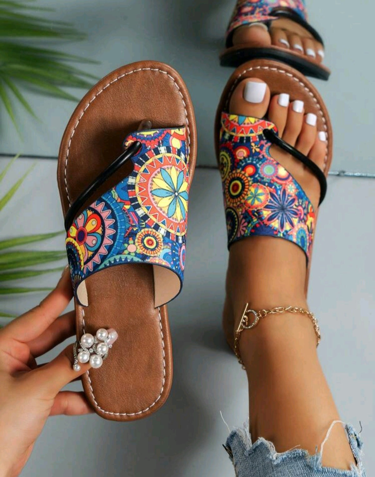 Címke nélküli, bohém stílusú, élénk színű mandala mintás papucs. Kényelmes, lapos talppal és barna műbőr talpbetéttel, amely biztosítja a kellemes viseletet egész nap. A lábujjköztes pánt fekete szegélyezéssel van ellátva, ami kiemeli a különleges dizájnt. Tökéletes választás nyári sétákhoz, strandoláshoz vagy egy könnyed, laza outfit kiegészítőjeként.