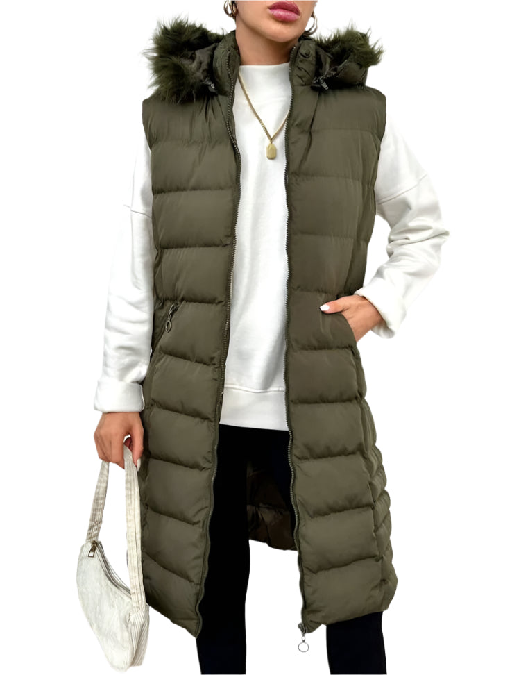 Címke nélküli, szőrmés kapucnival ellátott steppelt mellény, amely stílusos és meleg viseletet biztosít. Tökéletes őszi-téli napokra.