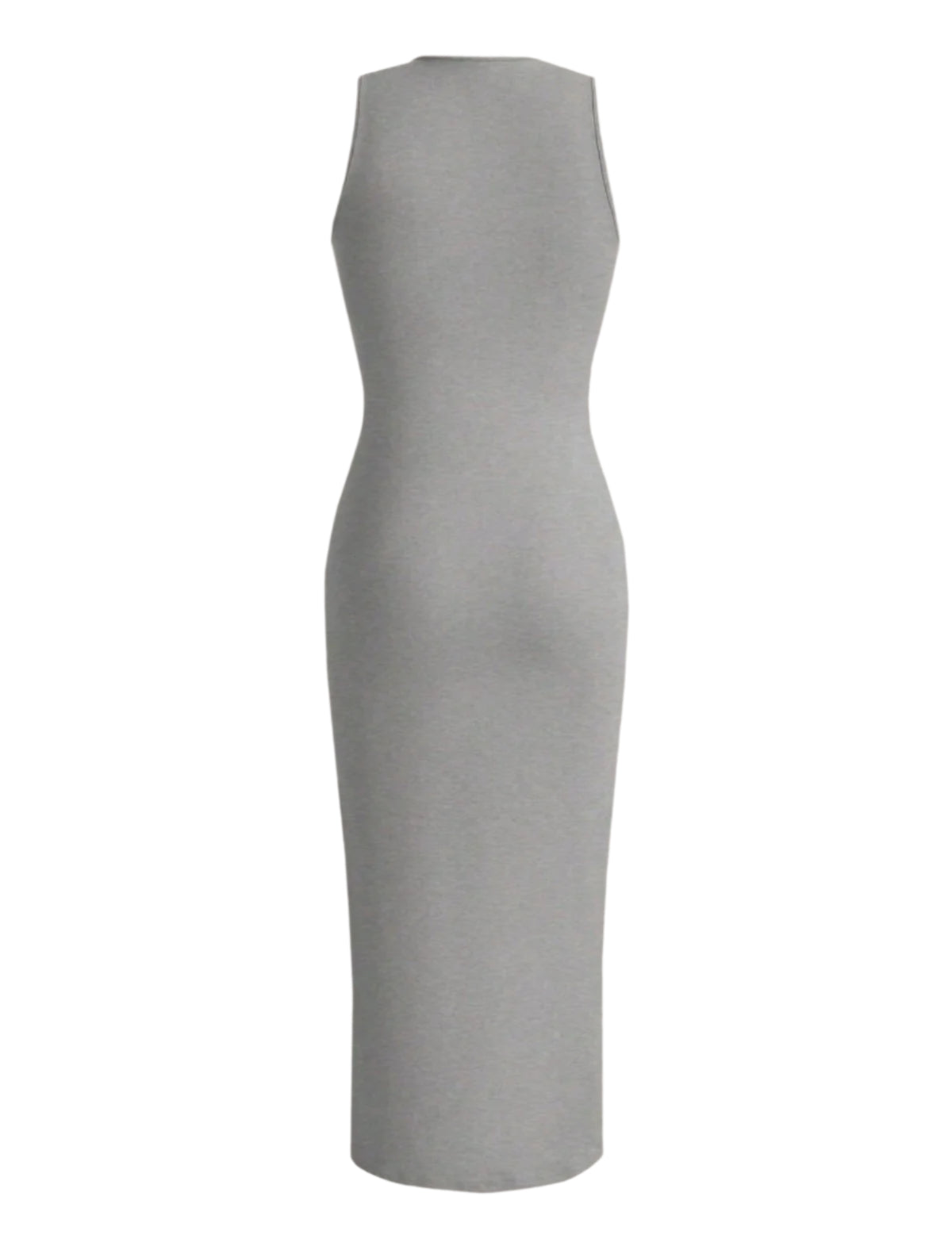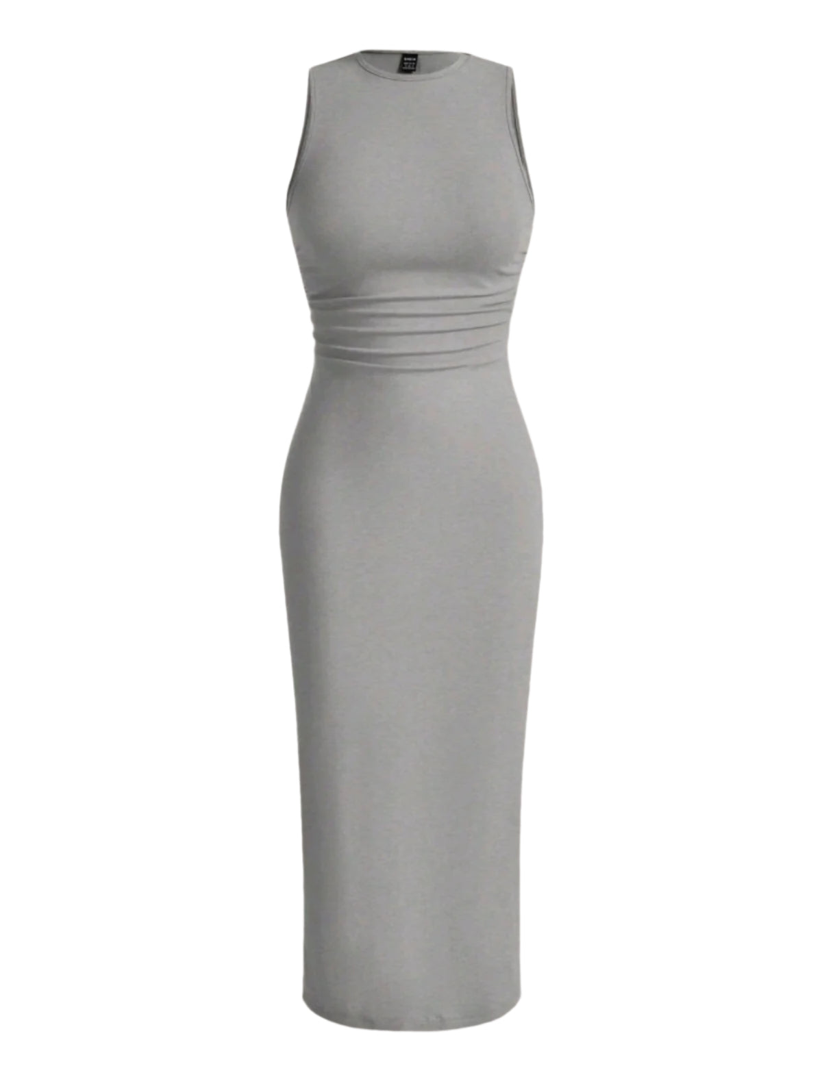 Címke nélküli, elegáns szürke midi ruha ujjatlan, kerek nyakú kialakítással. Testhezálló szabása kiemeli az alakot, míg az oldalán lévő finom ráncolás előnyösen formálja a derekat. Rugalmas, kényelmes anyagának köszönhetően tökéletes választás hétköznapi és alkalmi viseletre is.