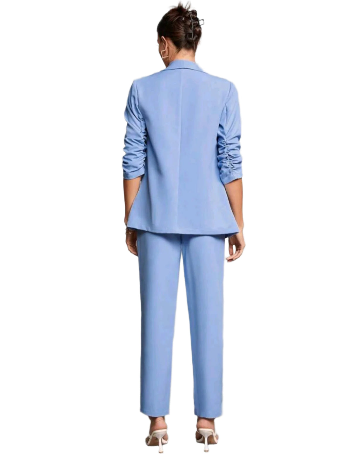 Címke nélküli, stílusos és modern két részes szett, amely egy laza szabású blézerből és egy hozzá illő, egyenes szabású nadrágból áll. Könnyed, elegáns viselet irodai munkához, alkalmakra vagy üzleti találkozókra. A blézer ujjai enyhén húzottak, ami nőies megjelenést biztosít. Tökéletes választás a kifinomult, mégis divatos megjelenéshez.