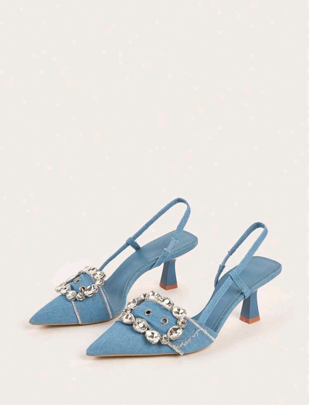 Címke nélküli, világoskék farmer anyagú, nyitott sarkú magassarkú cipő. Elöl nagy méretű, csillogó kövekkel kirakott csattal díszített, elegáns és feltűnő megjelenésű darab. Kényelmes sarokkialakítása miatt ideális választás különleges alkalmakra vagy stílusos hétköznapokra is.