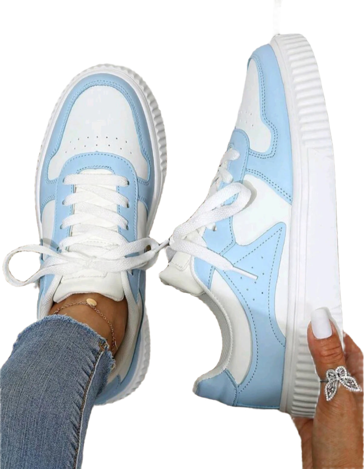 Címke nélküli, divatos világoskék és fehér színű sportcipő. Kényelmes, fűzős kialakítású, légáteresztő anyagokból készült, amely biztosítja a tökéletes illeszkedést és kényelmet. Vastag, bordázott talpa stabil járást garantál. Ideális hétköznapi viseletre és sportos megjelenéshez.
