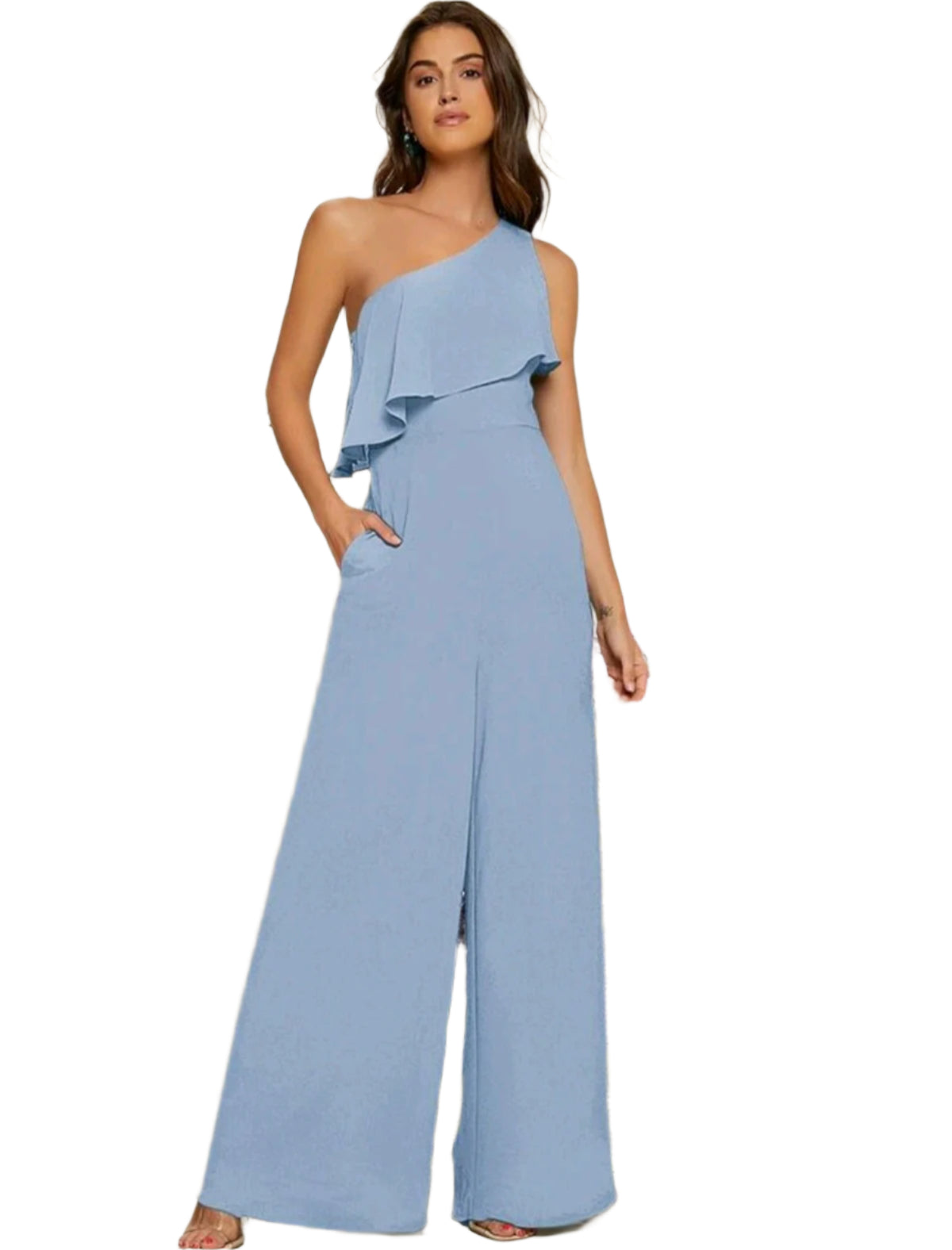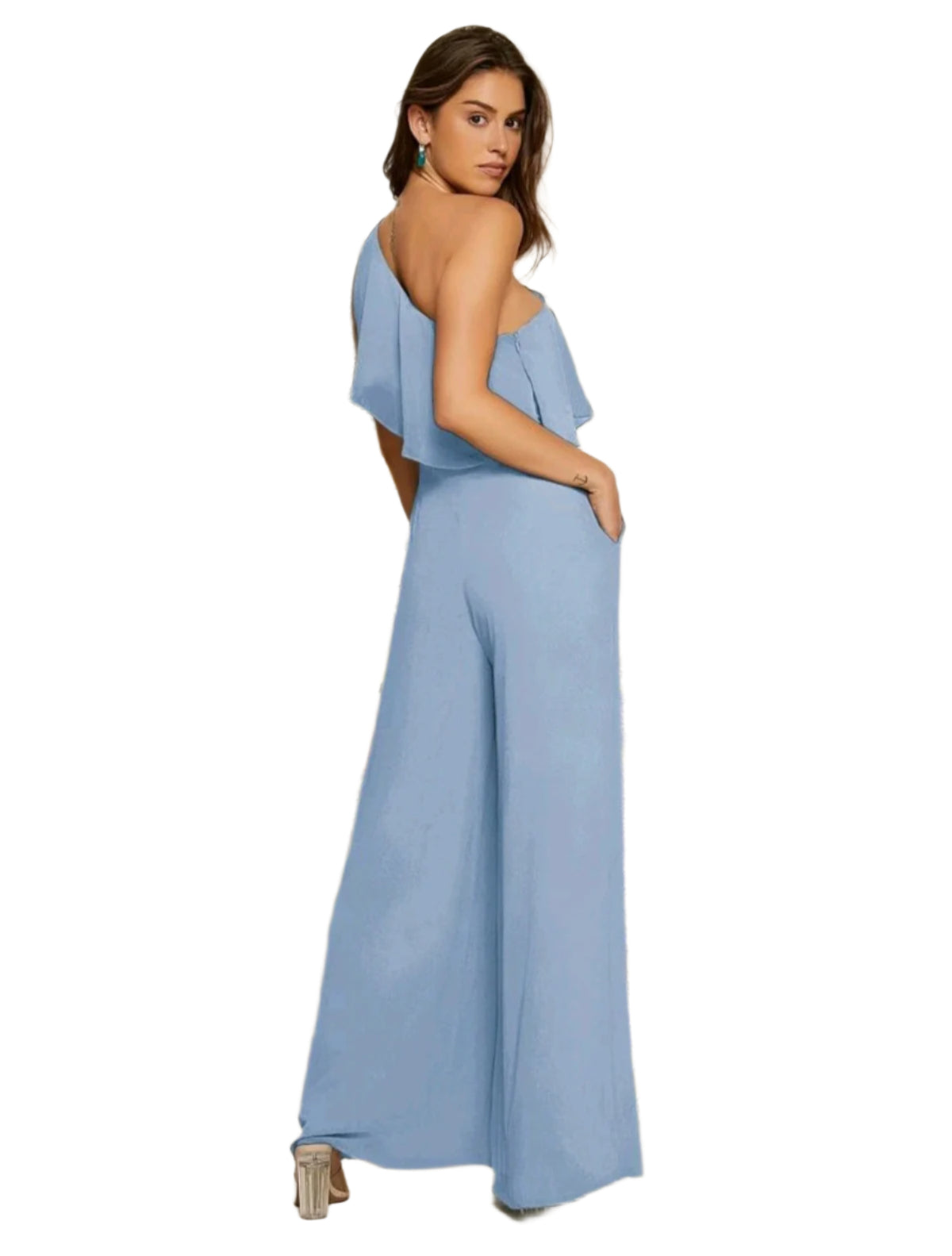 Címke nélküli, könnyed esésű, világoskék overál egyvállas kialakítással és romantikus fodorral az elején. A derékhangsúlyos szabás és a bő szárú nadrágrész elegánsan nyújtja az alakot. Kényelmes viselet esküvőre, nyári rendezvényekre vagy akár alkalmi vacsorákra is.