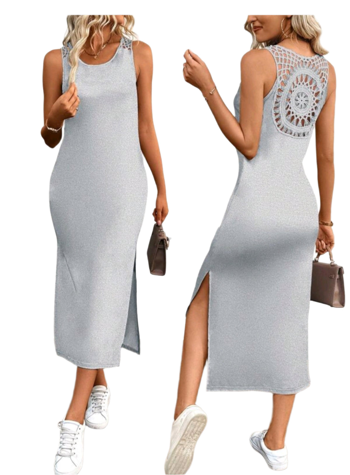 Címke nélküli, világosszürke ujjatlan midi ruha, amely egyszerre kényelmes és stílusos. Testhezálló szabása kihangsúlyozza az alakot, míg az oldalhasíték extra mozgásszabadságot biztosít. A hátrészen található gyönyörű horgolt díszítés egyedi, bohém megjelenést kölcsönöz a ruhának. Ideális hétköznapi viseletként, de sportosan és elegánsan is kombinálható.
