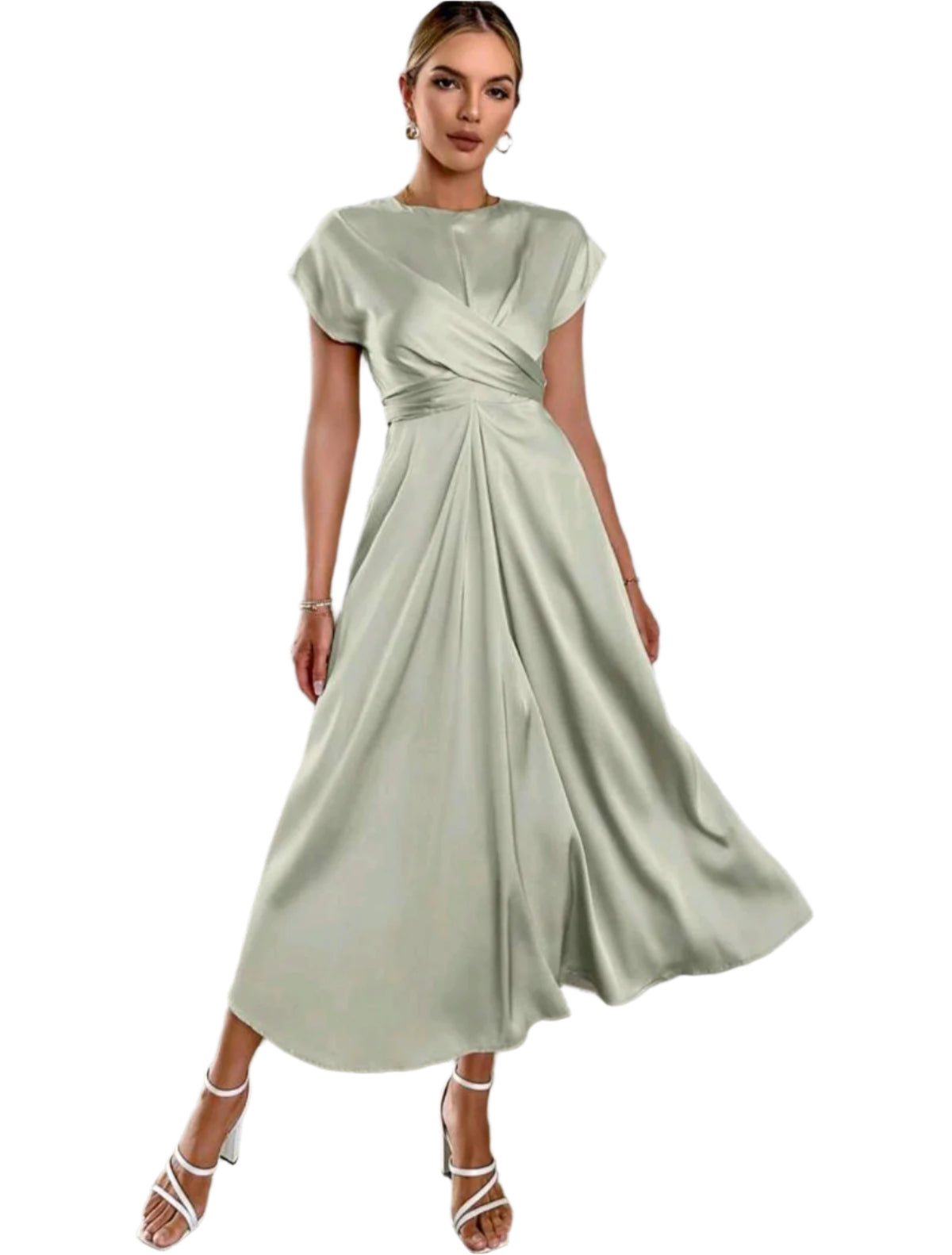 Címke nélküli, női midi ruha, világoszöld színben, selyemhatású fényes anyagból. Rövid ujjú, elegáns átlapolt mellrésszel és karcsúsított derékkal, amely kiemeli az alakot. Bő szoknyarésszel és finom redőzéssel díszítve, amely légies mozgást biztosít. Tökéletes választás alkalmi és elegáns eseményekre.