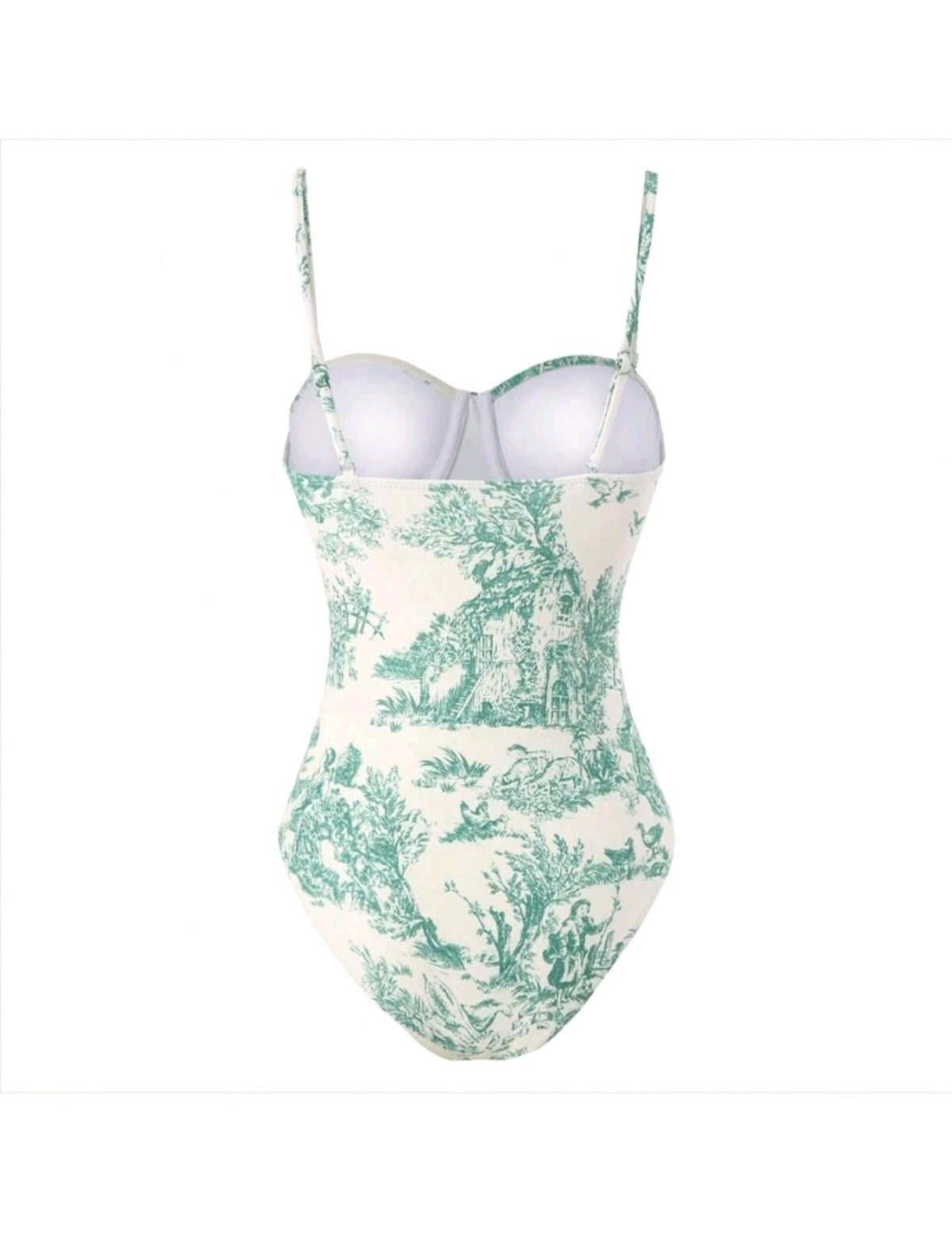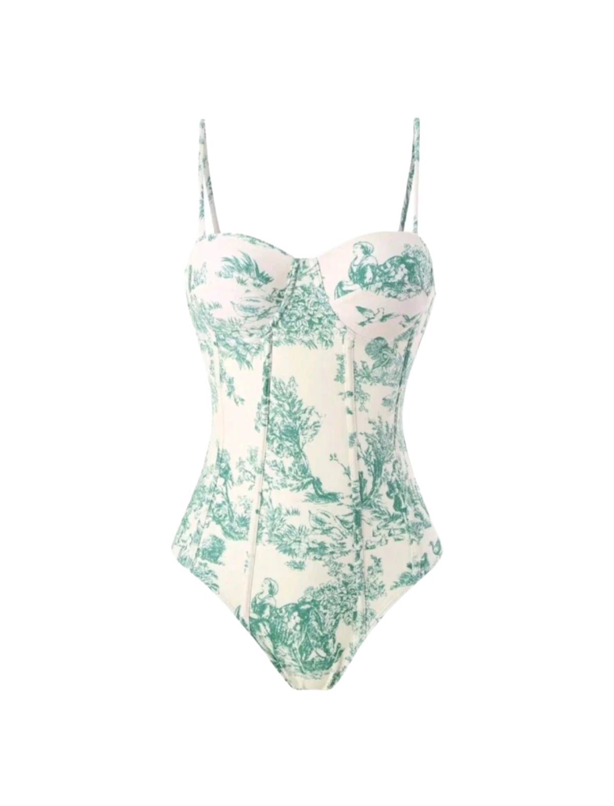 Címke nélküli, elegáns és egyedi megjelenésű egyberészes fürdőruha klasszikus zöld-fehér mintával. A kialakítása fűzőre emlékeztető szabással készült, enyhén merevített kosarakkal és vékony állítható pántokkal. A nyomott minta romantikus, vintage hangulatot idéz. Tökéletes választás kifinomult stílushoz, tengerpartra vagy wellness pihenéshez.