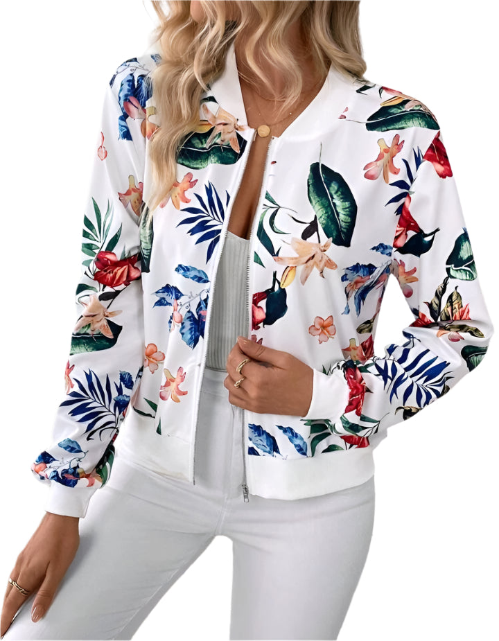 Címke nélküli, hosszú ujjú, cipzáras pulóver élénk, trópusi virágmintával. Könnyed, légies anyaga és rugalmas mandzsettái sportosan elegáns megjelenést biztosítanak. Tökéletes választás tavaszi és nyári outfitekhez.