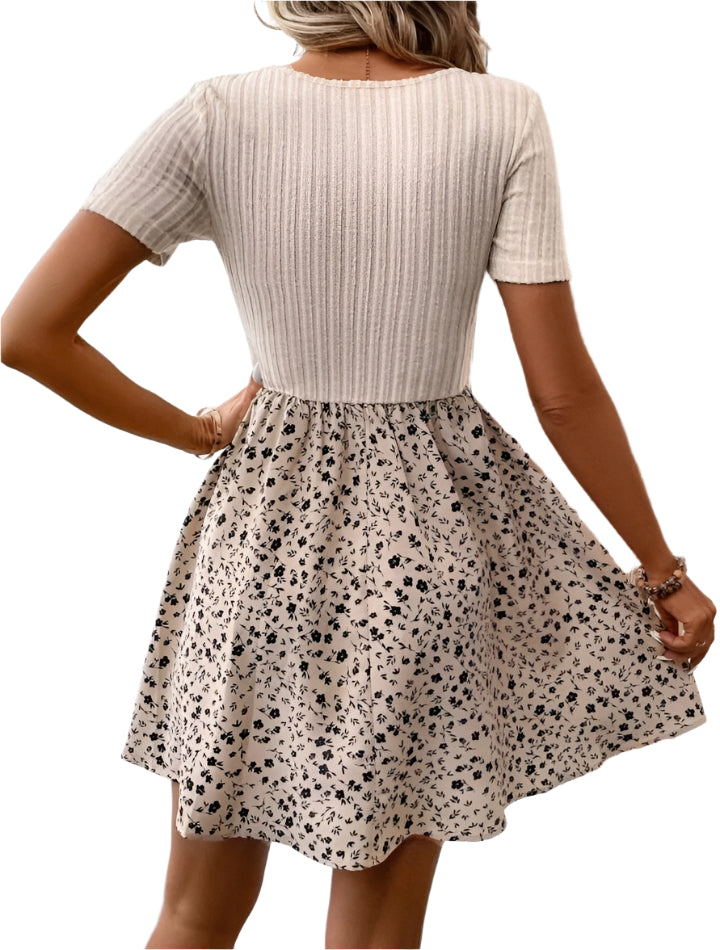 Címke nélküli, rövid ujjú, könnyed nyári ruha. Bordázott felsőrésszel és virágmintás, bő szoknyarésszel, amely kényelmes és nőies viseletet biztosít. Ideális választás meleg napokra és hétköznapi megjelenéshez.