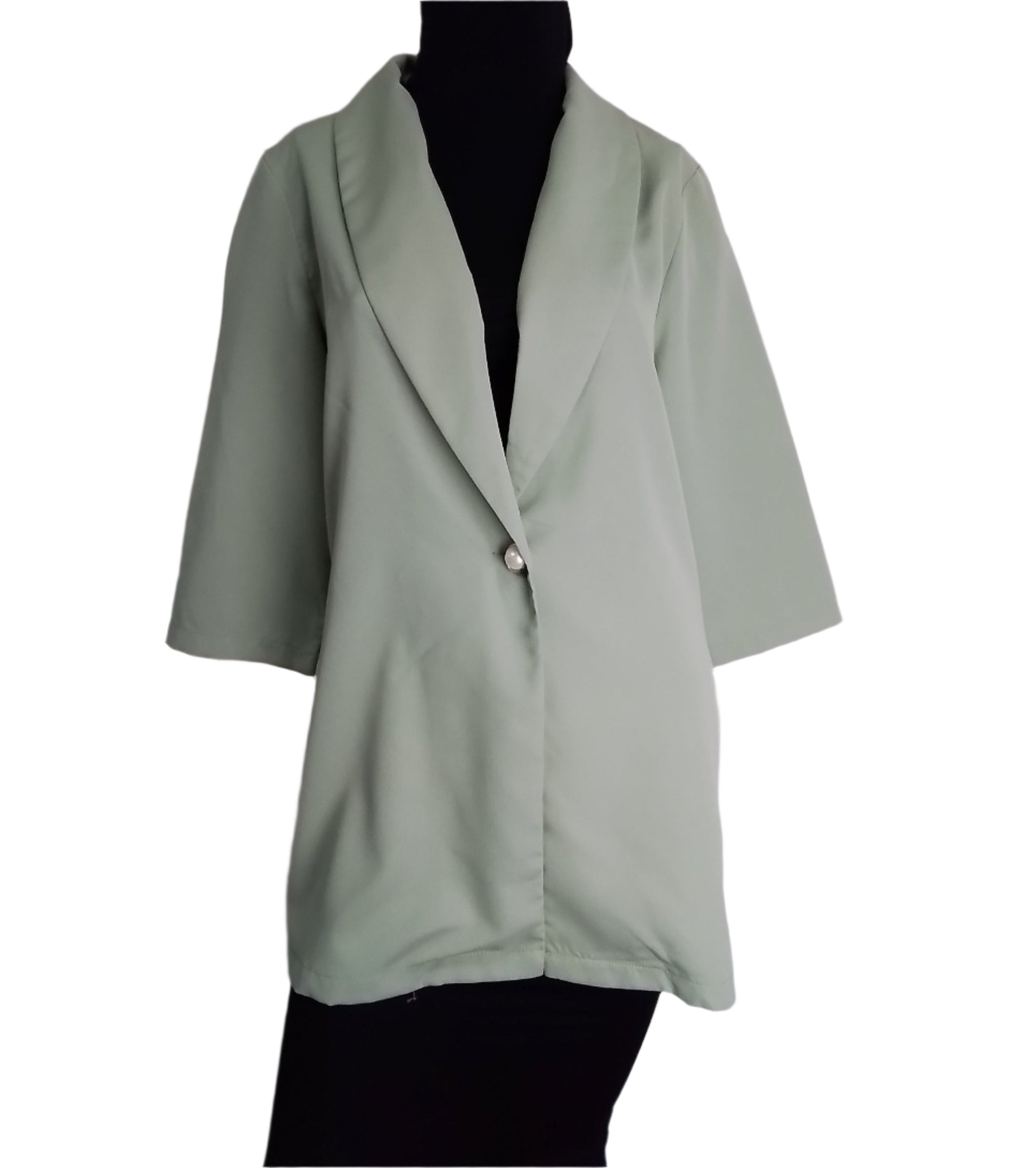 Címke nélküli, világos zöld bő szabású blézer, amely elegáns és modern megjelenést kölcsönöz. Egygombos záródása és széles hajtókája kifinomult stílust sugall. A háromnegyedes ujjhossz kényelmes viseletet biztosít, tökéletes választás alkalmi vagy üzleti öltözékhez.