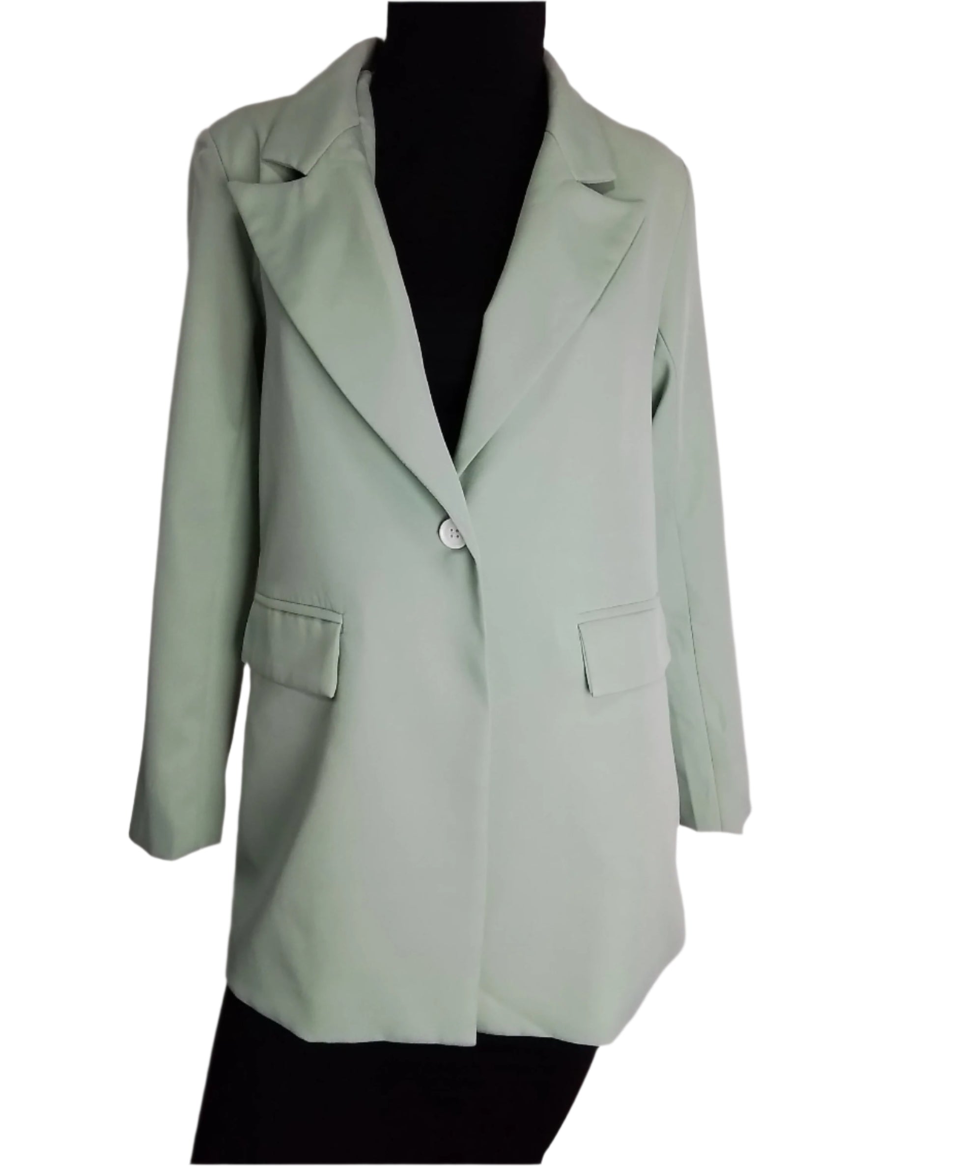 Címke nélküli, világos zöld egygombos blézer elegáns, letisztult szabással. Széles hajtókás kivitelezés, két zsebfedős díszzseb és enyhén hosszított fazon. Tökéletes választás alkalmi és üzleti viseletként is.