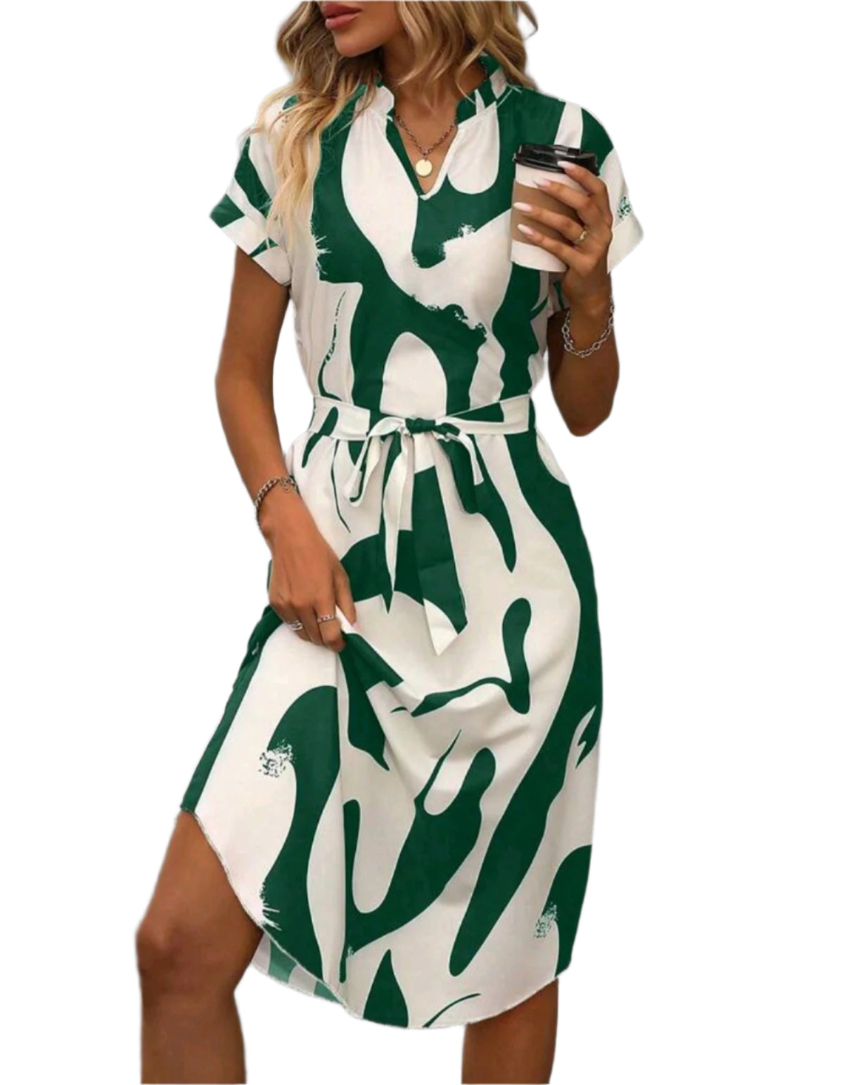 Címke nélküli, könnyű és lezser ingruha zöld-fehér absztrakt mintával, rövid ujjakkal és enyhén álló gallérral. Derékon megkötős övvel szabályozható a fazon. Térd fölé érő hosszával és ívelt alsó szegélyével modern és kényelmes viselet hétköznapokra, irodába vagy városi sétákhoz.