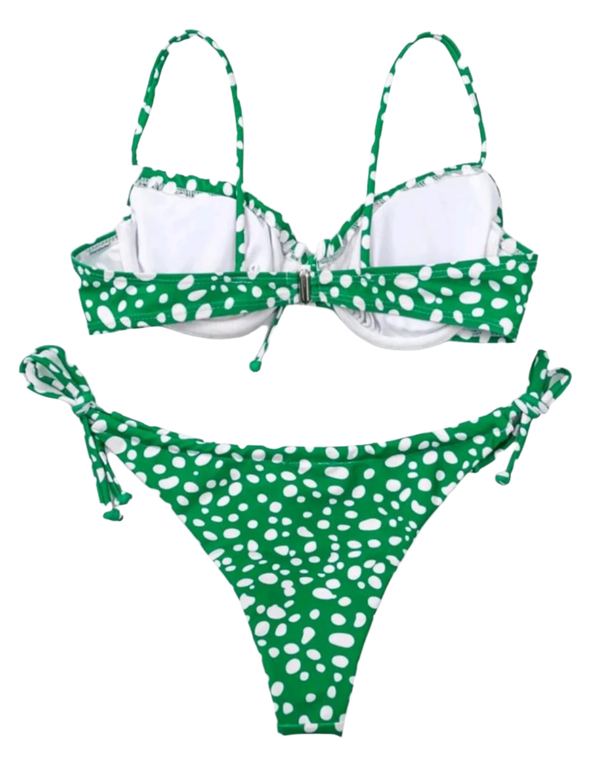 Címke nélküli, zöld alapon fehér pöttyös mintázatú bikini. A felsőrész állítható pántos, középen megköthető kialakítású, amely csinosan formálja a dekoltázst. Az alsórész klasszikus szabású, oldalt megkötős, így könnyedén méretre igazítható. Vidám és nőies megjelenést kölcsönöz, tökéletes választás nyári strandolásokhoz vagy vízparti nyaralásokhoz.