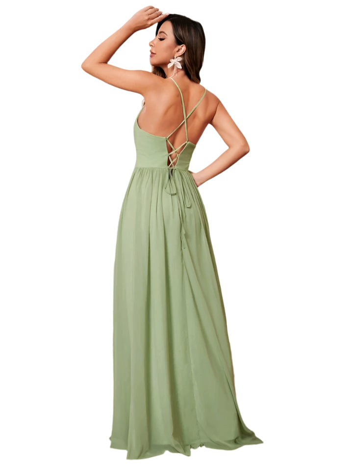 Címke nélküli, zöld maxi ruha. Mély V-nyakkivágással és vékony spagettipántokkal, amelyek elegáns és nőies megjelenést biztosítanak. Derékrésze rugalmas, hangsúlyozva az alakot. Az alsó részen magasan felsliccelt, amely kifinomult és csábító hatást kelt. Könnyed, légies anyaga tökéletes választás esküvőkre, különleges alkalmakra vagy nyári eseményekre.