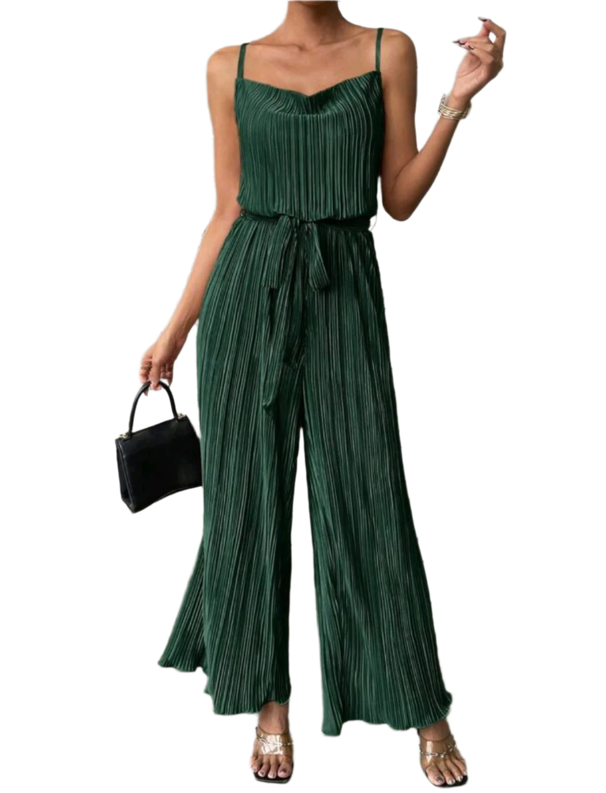 Címke nélküli, könnyed, pliszírozott anyagú overál állítható pántokkal, V-alakú nyakkivágással és derékmegkötővel. Széles szárú fazonja eleganciát sugall, ideális választás esküvőre, vacsorára vagy bármilyen különleges alkalomra.