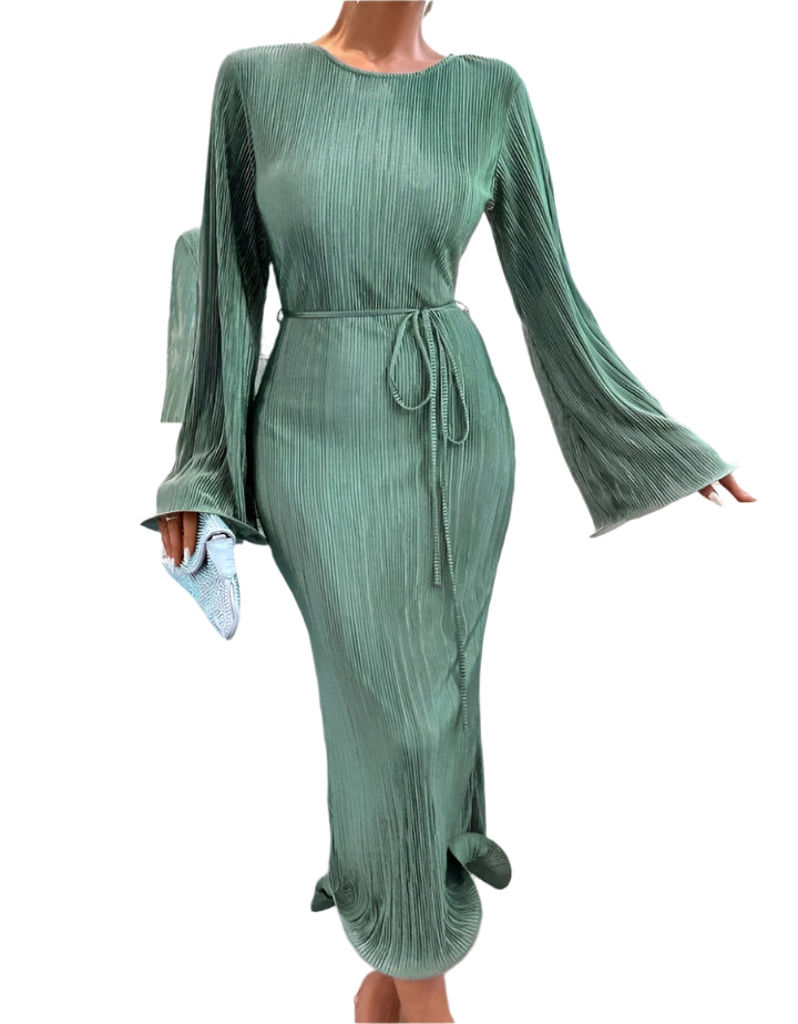 Címke nélküli, zöld, pliszírozott anyagú midi ruha elegáns és letisztult stílusban. Hosszú harangujjakkal és deréknál megköthető övvel, amely kiemeli az alakot. A lágyan redőzött anyag kifinomult megjelenést biztosít, míg az enyhén bővülő alsórész kényelmes viseletet nyújt. Tökéletes választás alkalmi eseményekre, esti programokra vagy elegáns hétköznapi öltözetként.