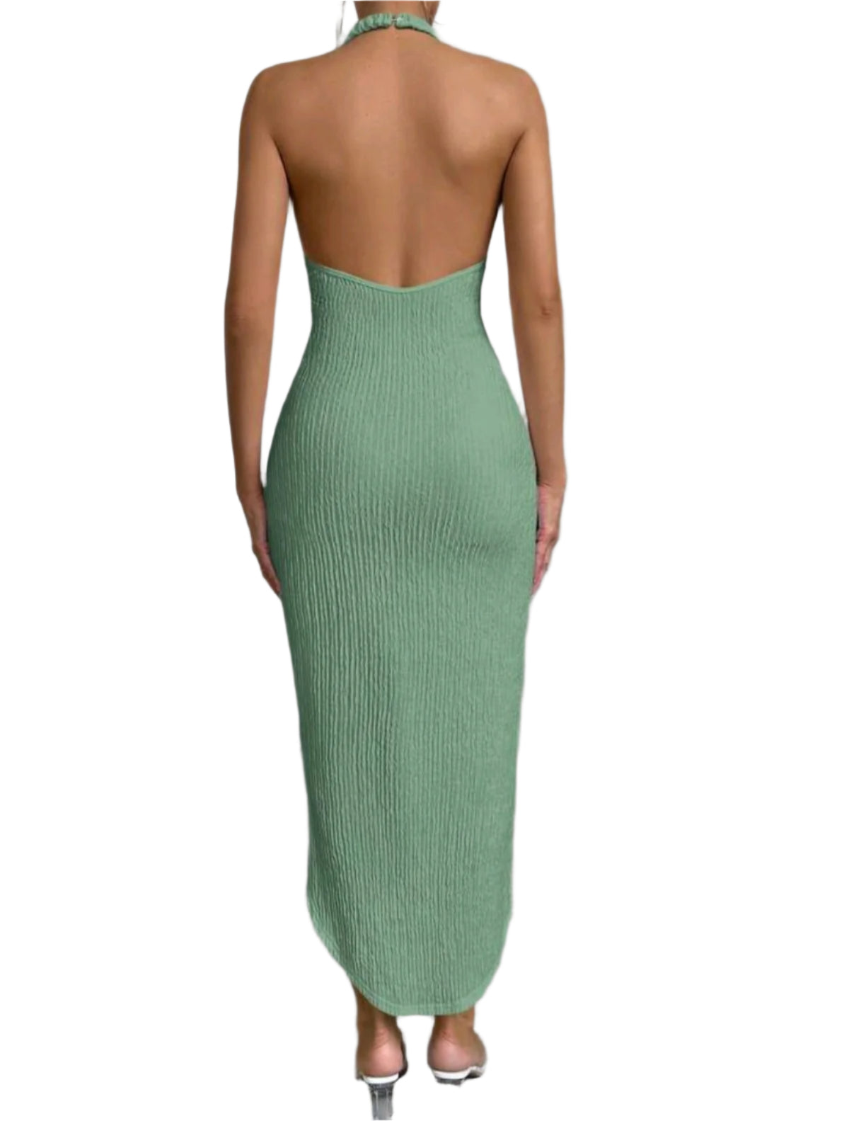 Címke nélküli, elegáns zöld midi ruha pliszírozott anyagból. Magasan záródó nyakkivágása modern és kifinomult megjelenést biztosít, míg az aszimmetrikus szoknyarész nőies hatást kölcsönöz. Rugalmas, testhezálló szabásának köszönhetően kényelmes és kiemeli az alakot. Tökéletes választás alkalmi eseményekre, vacsorákra vagy elegáns megjelenéshez.