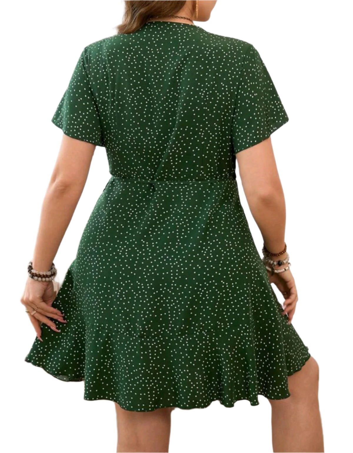 Címke nélküli, női ruha, nyári, sötétzöld alapon apró fehér pöttyökkel, V-kivágású átlapolt felsőrésszel, rövid, bő ujjakkal, megkötős derékrésszel, fodros, A-vonalú szoknyarésszel, könnyű, légies anyagból, ideális hétköznapi viseletre, városi sétákhoz vagy nyaraláshoz.