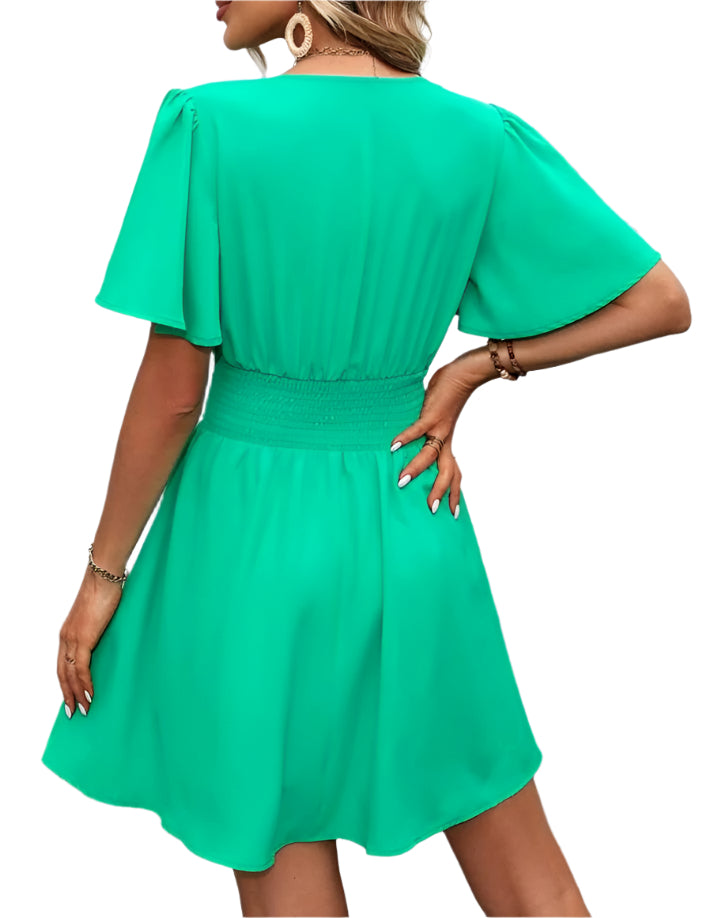 Címke nélküli, zöld rövid ujjú mini ruha. Könnyed, légies anyagból készült, mély V-kivágással és rövid, bő szárnyas ujjakkal. Karcsúsított, redőzött derékrészével nőies vonalakat hangsúlyoz. Tökéletes választás nyári programokra, romantikus sétákhoz vagy nyaraláshoz.