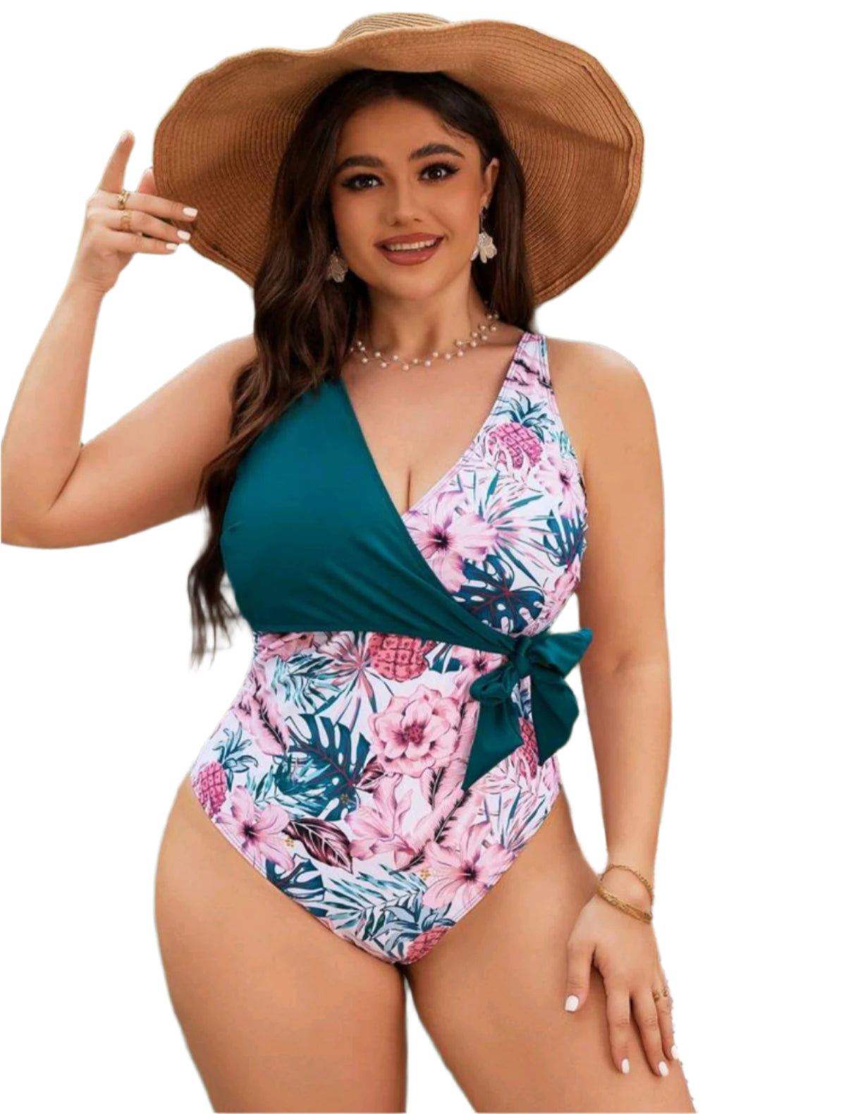 Címke nélküli, nőies szabású egyberészes fürdőruha zöld és rózsaszín színkombinációban. A keresztpántos felsőrész egyik fele egyszínű zöld, míg a másik virágmintás, amely szépen kiemeli a dekoltázst. Deréknál oldalt megkötős részlet díszíti, amely karcsúsító hatást kelt. Kényelmes, mégis stílusos választás tengerpartra vagy medencéhez.