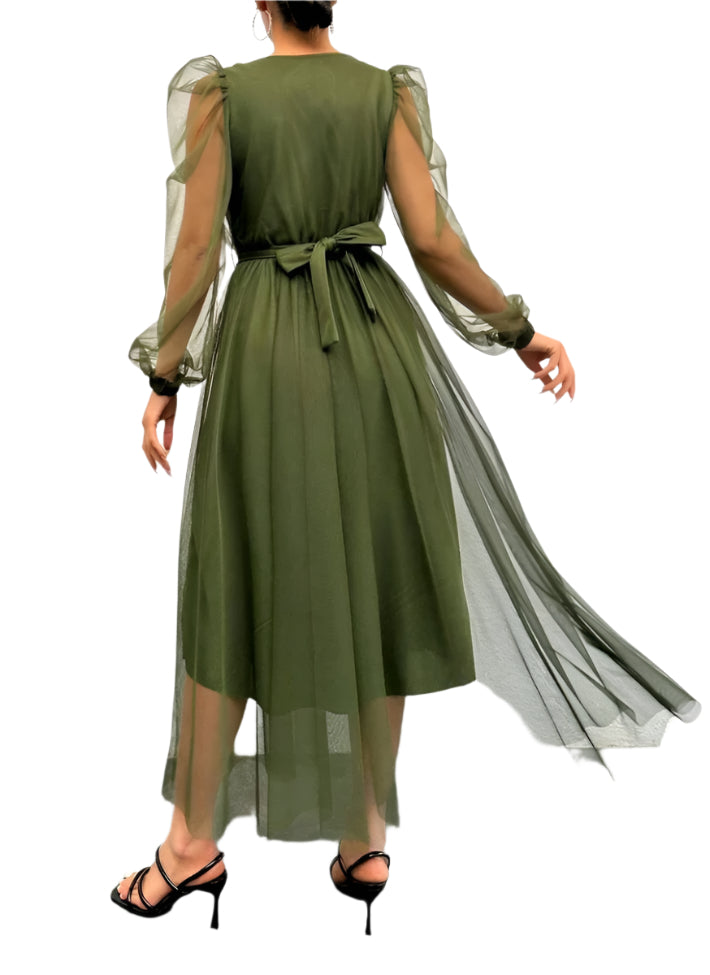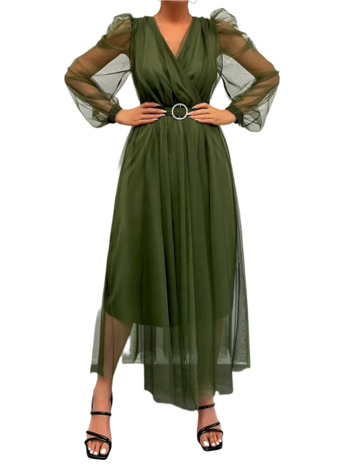 Címke nélküli, elegáns tüll midi ruha zöld színben. A mélyen dekoltált, keresztbe szabott felsőrész nőies megjelenést biztosít, míg a puffos, áttetsző ujjakkal és övvel ellátott derékrész kiemeli az alakot. A könnyed tüllréteg légies esést ad a ruhának, tökéletes választás esküvőre, elegáns eseményekre vagy romantikus vacsorára. Párosítsd magassarkúval a tökéletes kifinomultságért!