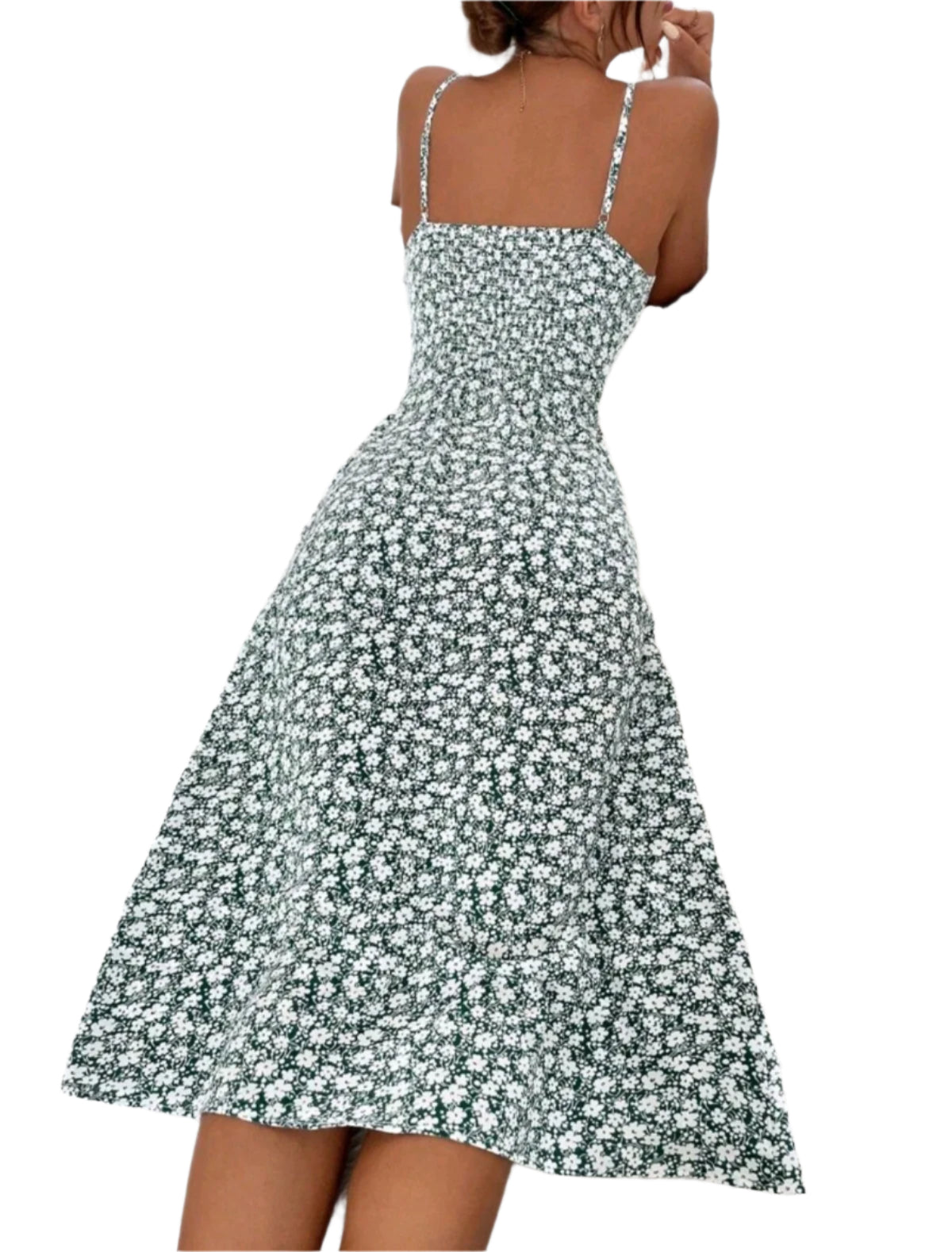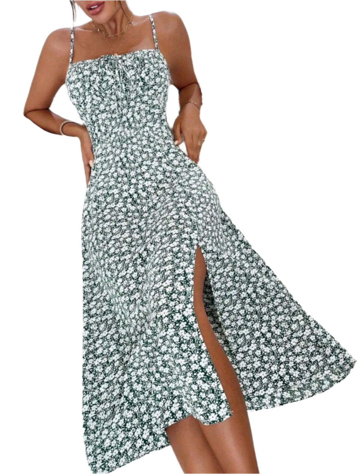 Címke nélküli, könnyed anyagú, apró virágmintás midiruha állítható spagettipántokkal és mellrésznél húzott kialakítással. Magasított slicc a szoknyarészen, karcsúsított szabás. Ideális választás tavaszi-nyári hétköznapokra vagy romantikus sétákhoz.