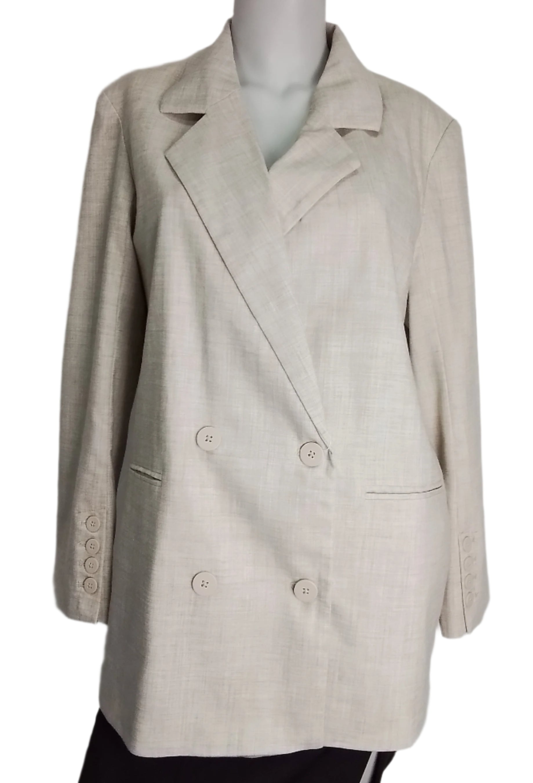 Címke nélküli, klasszikus bézs színű blézer elegáns duplasoros gombolással. Laza fazonú, finoman szövött anyagból készült, kényelmes viselet a mindennapokra vagy formális alkalmakra. Két oldalsó zsebbel és gombos mandzsettával.