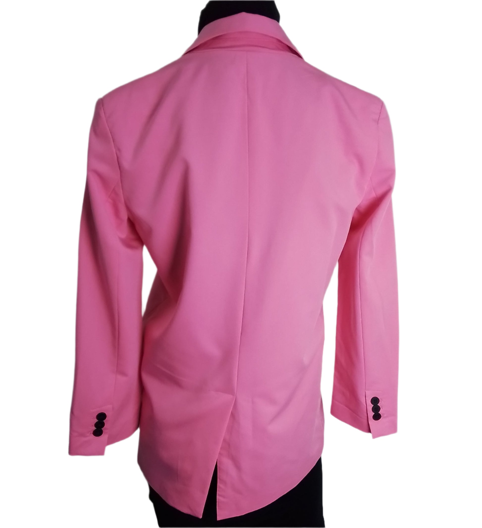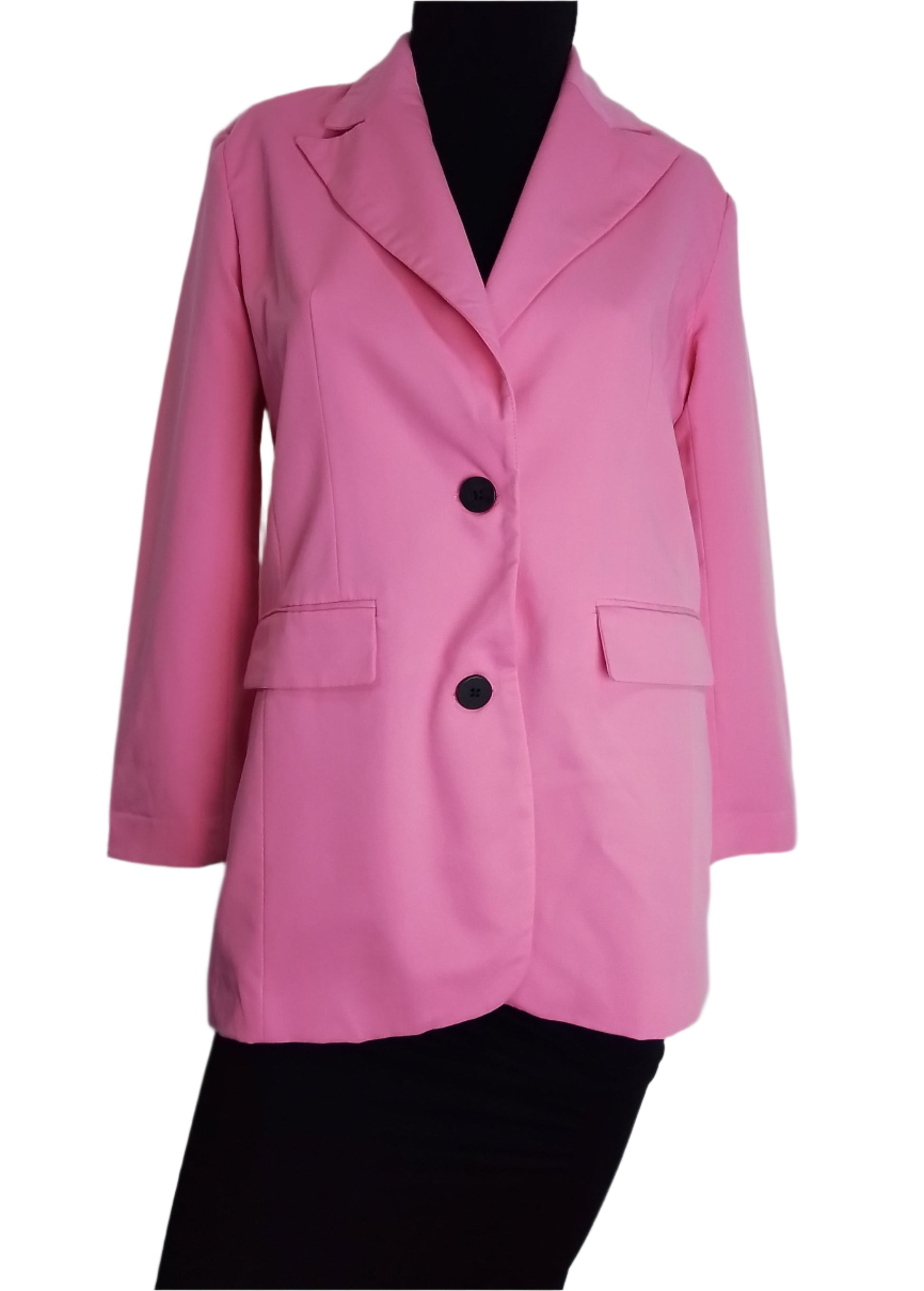 Címke nélküli, elegáns rózsaszín blézer klasszikus fazonnal. Két elülső zsebfedős zsebbel és fekete gombos záródással rendelkezik. Tökéletes választás elegáns, irodai vagy hétköznapi viselethez.