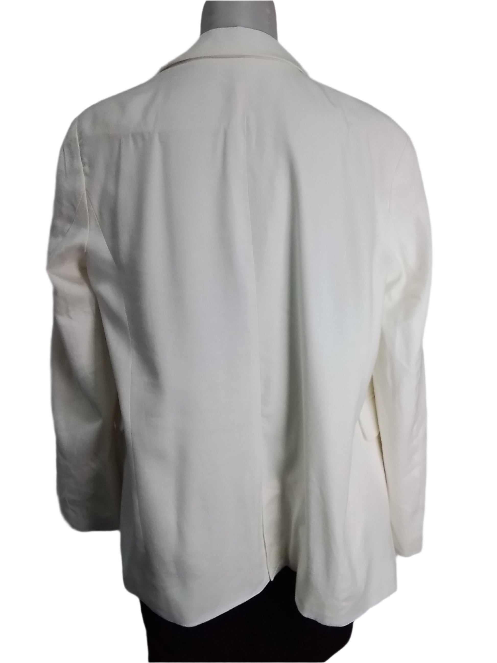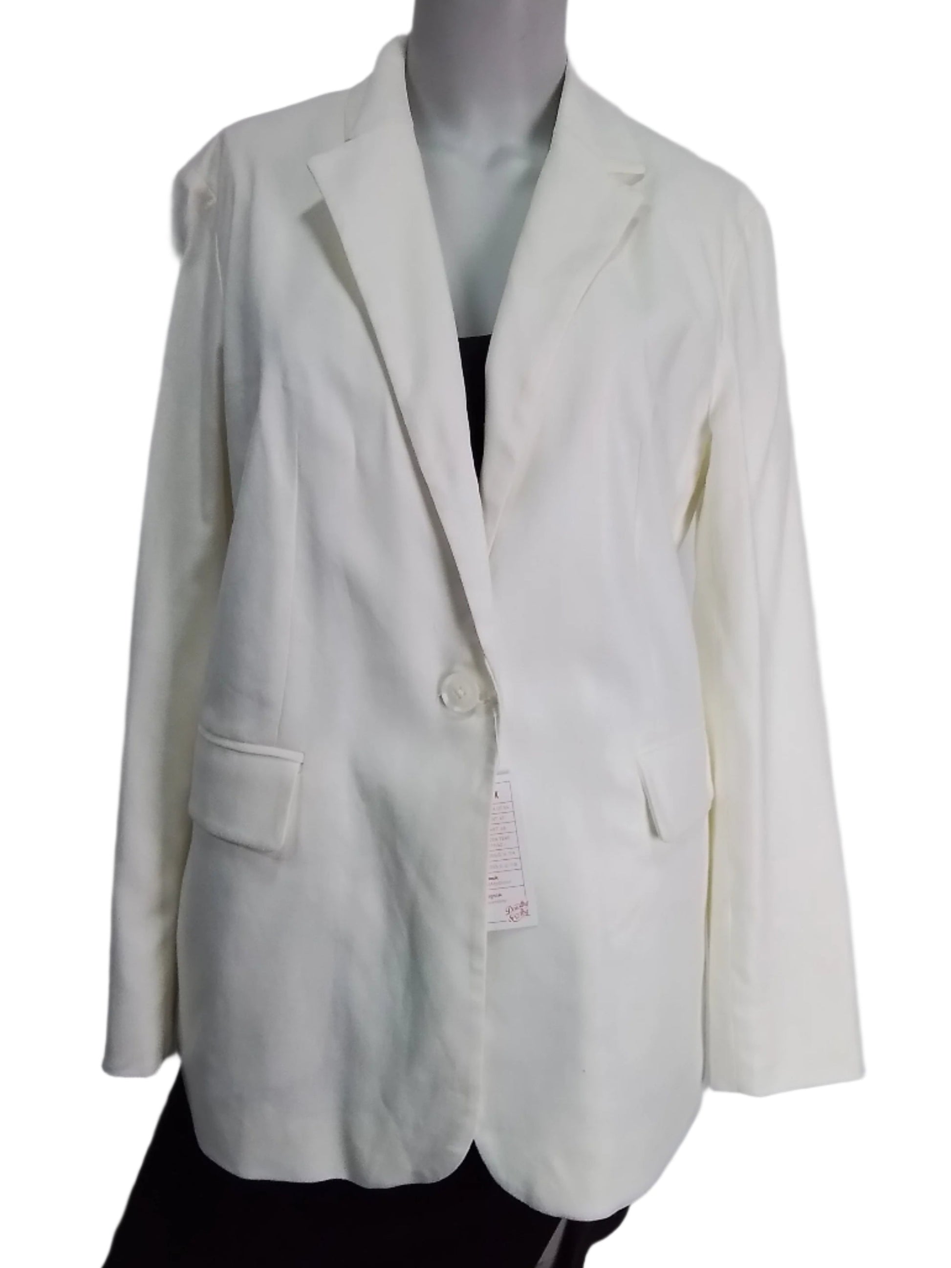 Címke nélküli, női fehér blézer, klasszikus egygombos záródással, galléros kialakítással, hosszú ujjal, két elülső zsebfedős zsebbel, elegáns és letisztult stílus, tökéletes alkalmi vagy irodai viselethez.