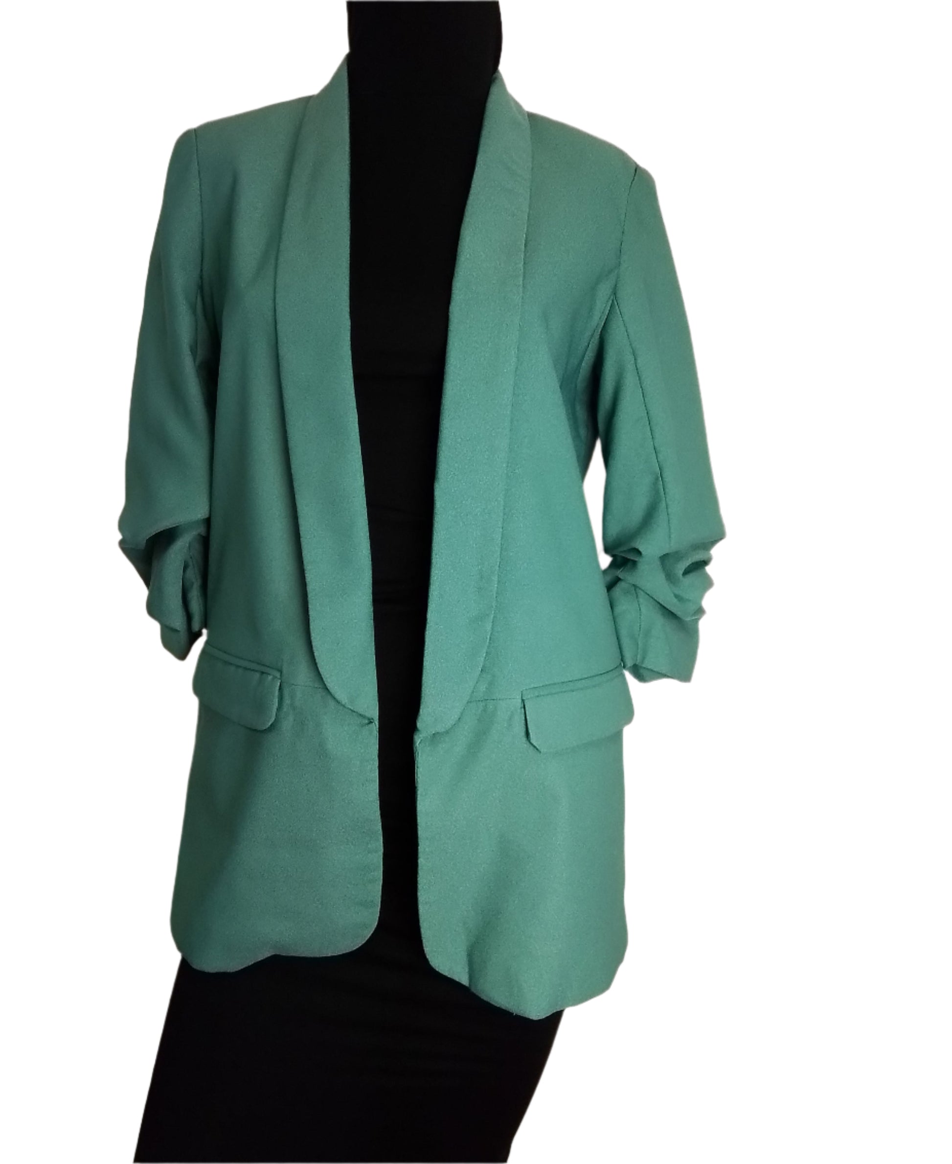 Címke nélküli, zöld laza szabású blézer letisztult és elegáns kialakítással. Nyitott fazonja kényelmes viseletet biztosít, míg a felhajtott ujjrész modern hatást kelt. Két díszzsebbel rendelkezik, amelyek fokozzák az eleganciát. Tökéletes választás mind hétköznapi, mind üzleti megjelenéshez.
