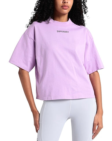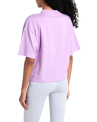 Címke nélküli, lila színű női póló. Rövid, bő ujjú fazonú, magasított nyakkivágással rendelkezik.
