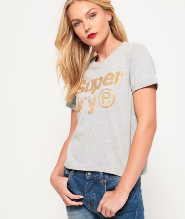 Címke nélküli, szürke márvány mintás női póló. Rövid ujjú, kerek nyakkivágással rendelkezik. A mellkasán nagyméretű, arany színű "Super Dry®" felirat látható.